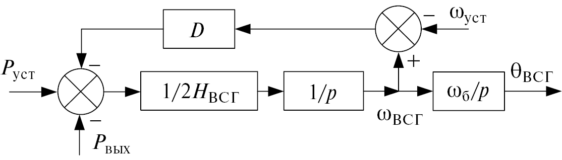 Исходя из основной идеи системы управления на основе ВСГ, заключающейся в имитации свойств и возможностей синхронной генерации, в ней можно выделить три основных контура: внутренний контур управления, модель виртуального СГ и внешний контур управления [13]. Известно, что инерционный отклик ВСГ определяется используемым в структуре управления уравнением движения виртуального ротора. Причем за счет введения демпферного коэффициента D осуществляется аппроксимативный учет демпфирующих свойств СГ. Также в традиционной реализации ВСГ-Н демпферный коэффициент и коэффициент статизма довольно часто объединяются, и уравнение движения преобразуется в вид: