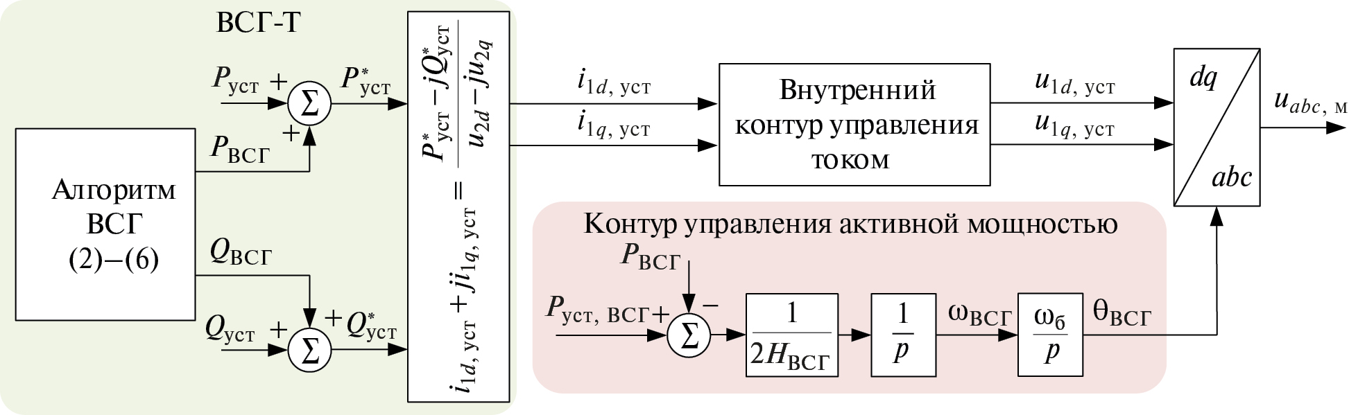 Для устранения ранее обозначенных недостатков ВСГ-Н, препятствующих применению эффективных адаптивных подходов к управлению виртуальной постоянной инерции и демпферным коэффициентом, в статье предлагается модифицированная структура ВСГ-Т [18]. Структурная схема ВСГ-Т представлена на рис. 4. Основной особенностью данной модели является параллельная работа контуров, формирующих опорные значения мощности. Первый из них отвечает за формирование уставок по активной и реактивной мощности (Pуст и Qуст). Второй контур воспроизводит динамику ВСГ, формируемые выходные мощности PВСГ и QВСГ которого затем прибавляются к значениям уставок. Из результирующих опорных значений мощностей Pуст* и Qуст* вычисляются опорные значения токов i1dq, уст для внутреннего контура управления током. Структурно внутренний контур управления током представлен аналогично ВСГ-Н пропорционально-интегральными регуляторами с коэффициентами усиления Kpcc и Kicc.