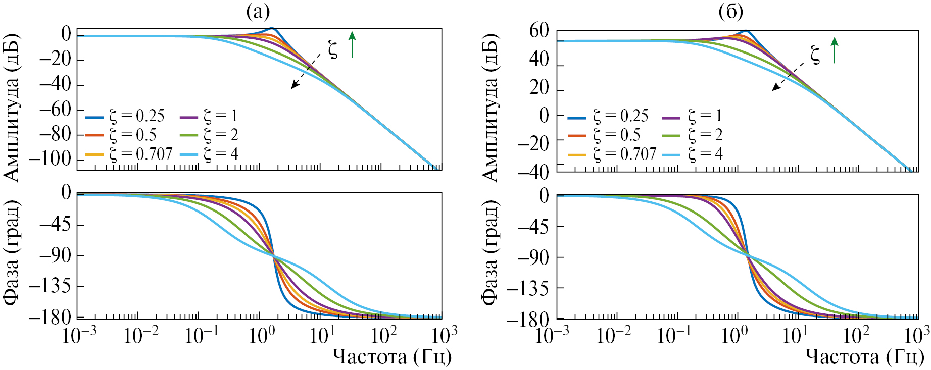 На рис. 6a показаны логарифмические амплитудно-фазовые частотные характеристики (ЛАФЧХ) замкнутой передаточной функции ΔPвых/ΔPуст для традиционной структуры ВСГ. Как было отмечено ранее, GP/P_ВСГ-Н(p) является типовым звеном второго порядка, и по мере увеличения коэффициента демпфирования ζ величина перерегулирования уменьшается. Однако, что более важно в рамках разрабатываемых адаптивных алгоритмов, рост демпфирования сопровождается уменьшением полосы пропускания и, соответственно, снижением быстродействия системы управления. В результате в случае адаптивного изменения коэффициента демпфирования будет необходим поиск компромисса между способностью подавлять перерегулирование и скоростью реакции системы управления.