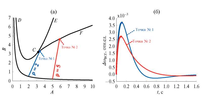 Сделанные предположения о влиянии параметров на динамический отклик системы подтверждаются полученными переходными характеристиками во временной области для выражения (2). На рис. 3а представлены две точки с разными интересуемыми значениями A и B. Переходные характеристики на рис. 3б доказывают, что выбор точки № 2 на линии CF, соответствующей большему значению ρ, позволяет добиться меньшей величины и скорости отклонения частоты вращения ВСГ, что является целью адаптивного управления на этапе ускорения.