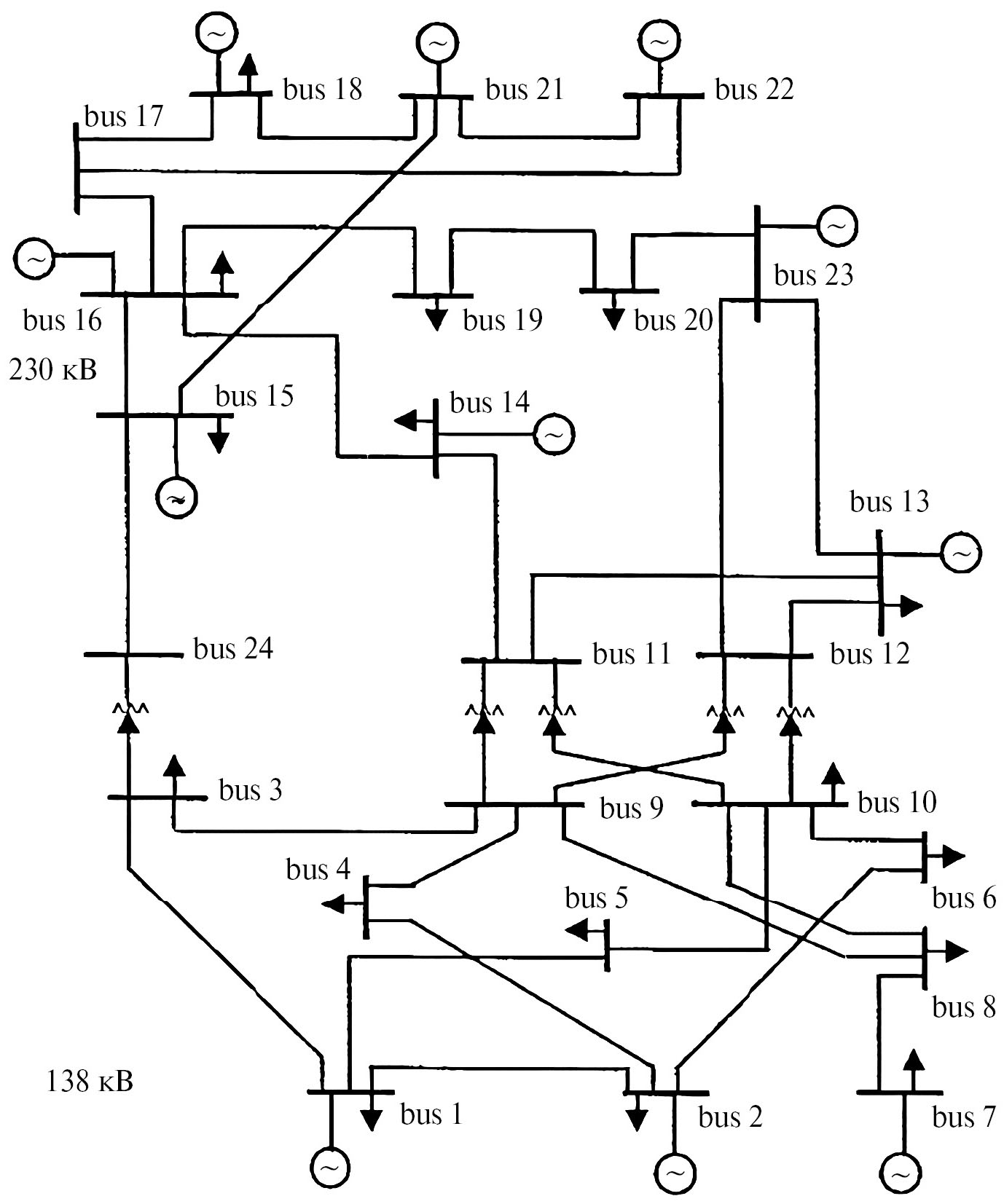 Были проведены экспериментальные исследования представленной методики формирования графиков ремонтов генерирующего оборудования. Экспериментальные исследования проводились на тестовой расчетной схеме IEEE RTS-96 (рис. 2). Основные исходные данные схемы, в том числе параметры элементов, используемые при экспериментальных исследованиях, представлены в [33].