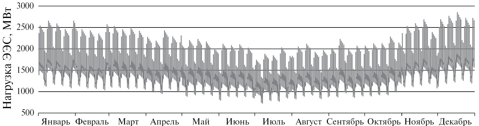 Исследование проводилось для двух вариантов графика потребления активной мощности. Первый вариант графика потребления мощности соответствовал данным IEEE RTS-96 [32], этот график представлен на рис. 3. Второй вариант графика потребления мощности был видоизменен в направлении создания провала потребления мощности в летний период, этот график представлен на рис. 4.