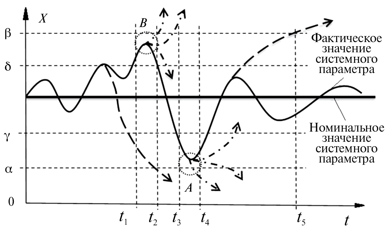 Частные компоненты параметра Х могут принимать значения {γ > α, δ < β}, что определяет область частичного гомеостаза {γ < Х < δ}. При {γ < Х < α} или {δ < Х < < β} сложная производственная система обычно переходит в новое качественное состояние, но продолжает функционировать как единый объект. Это происходит в диапазонах времен {t1, t2} и {t3, t4}. Приближение системного параметра к предельно допустимым значениям (области А и В, рис. 4) может привести к системному кризису, когда дальнейшая работа сложной производственной системы может быть нарушена. При переходе сложной производственной системы в зону бифуркации ее состояние становится непредсказуемым.