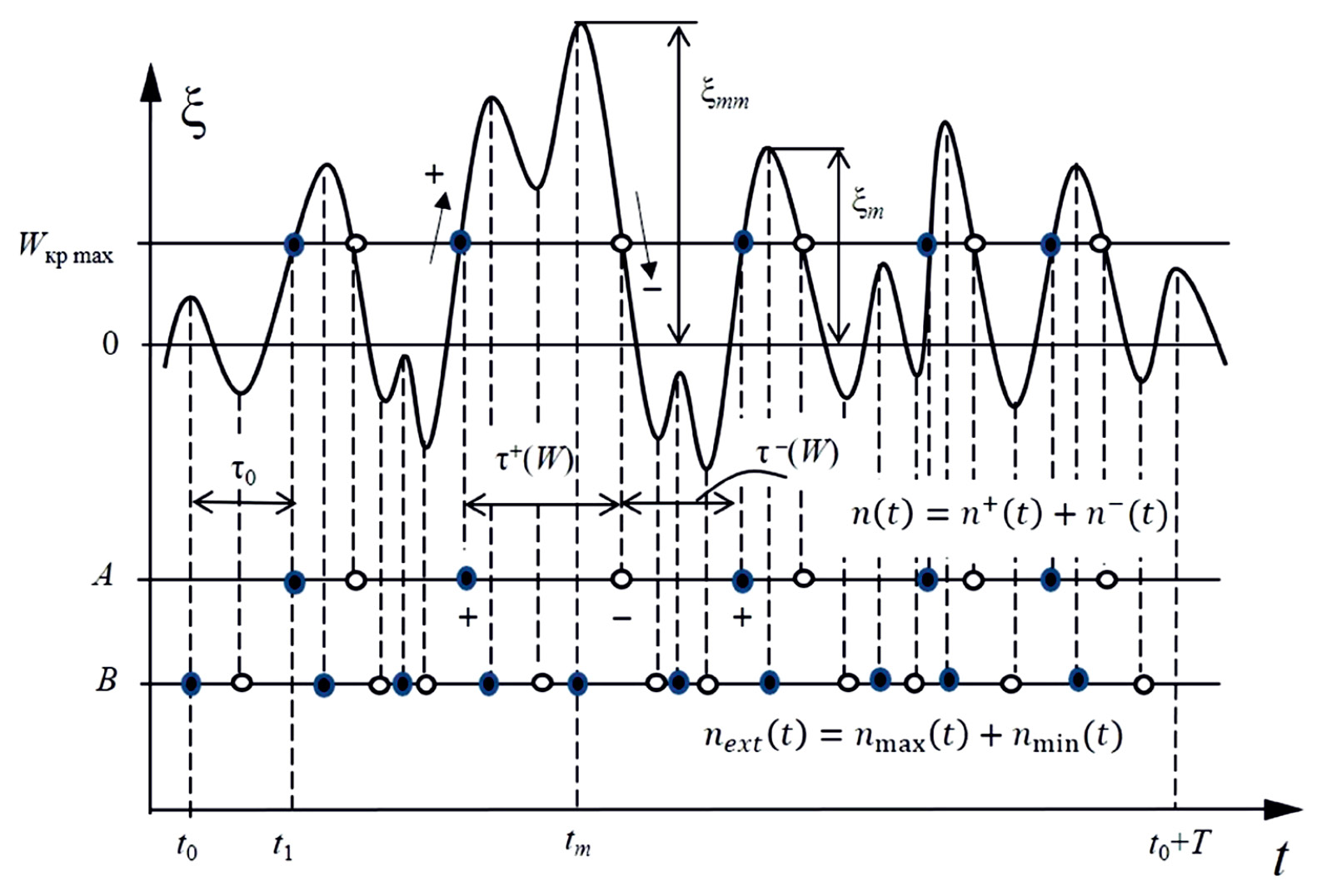 Величины τ+(W) = τ+–(W) и τ–(W) = τ–+(W) – это длительности положительных и отрицательных выбросов между положительными (+) и отрицательными (–) пересечениями критического уровня Wкр max. В момент времени t = t1 траектория ξ(t) впервые выходит за предел Wкр max, а время его достижения – τ0. Функция ξ(t) на интервале T < ∞ имеет конечное число максимумов nmax(T) и минимумов nmin(T) с различными амплитудами ξm. В момент времени tm траектория ξ(t) достигает абсолютного максимума ξmm. Такой подход позволяет описать траекторию ξ(t) определенным числом ее экстремальных амплитуд с указанием длительности интервалов между отдельными экстремумами. Это требуется для создания системы автоматического управления электропотреблением.