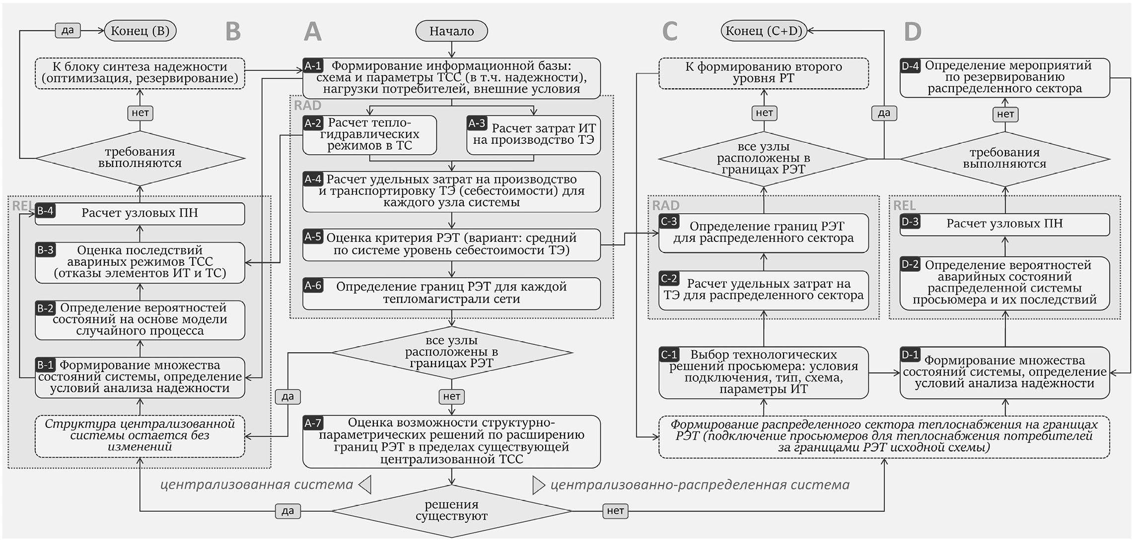 Рис. 4. Алгоритм решения исследуемых задач развития централизованно-распределенных ТСС: блок A – определение границ эффективности централизованного теплоснабжения исходной схемы на основе критерия РЭТ; блок B – анализ надежности в границах эффективности с переходом к блоку синтеза (обеспечения) надежности при необходимости; блок C – определение границ эффективности распределенного сектора теплоснабжения, формируемого из узлов исходной схемы, находящихся за границами РЭТ; блок D – анализ и обеспечение надежности распределенного сектора теплоснабжения на базе просьюмера.