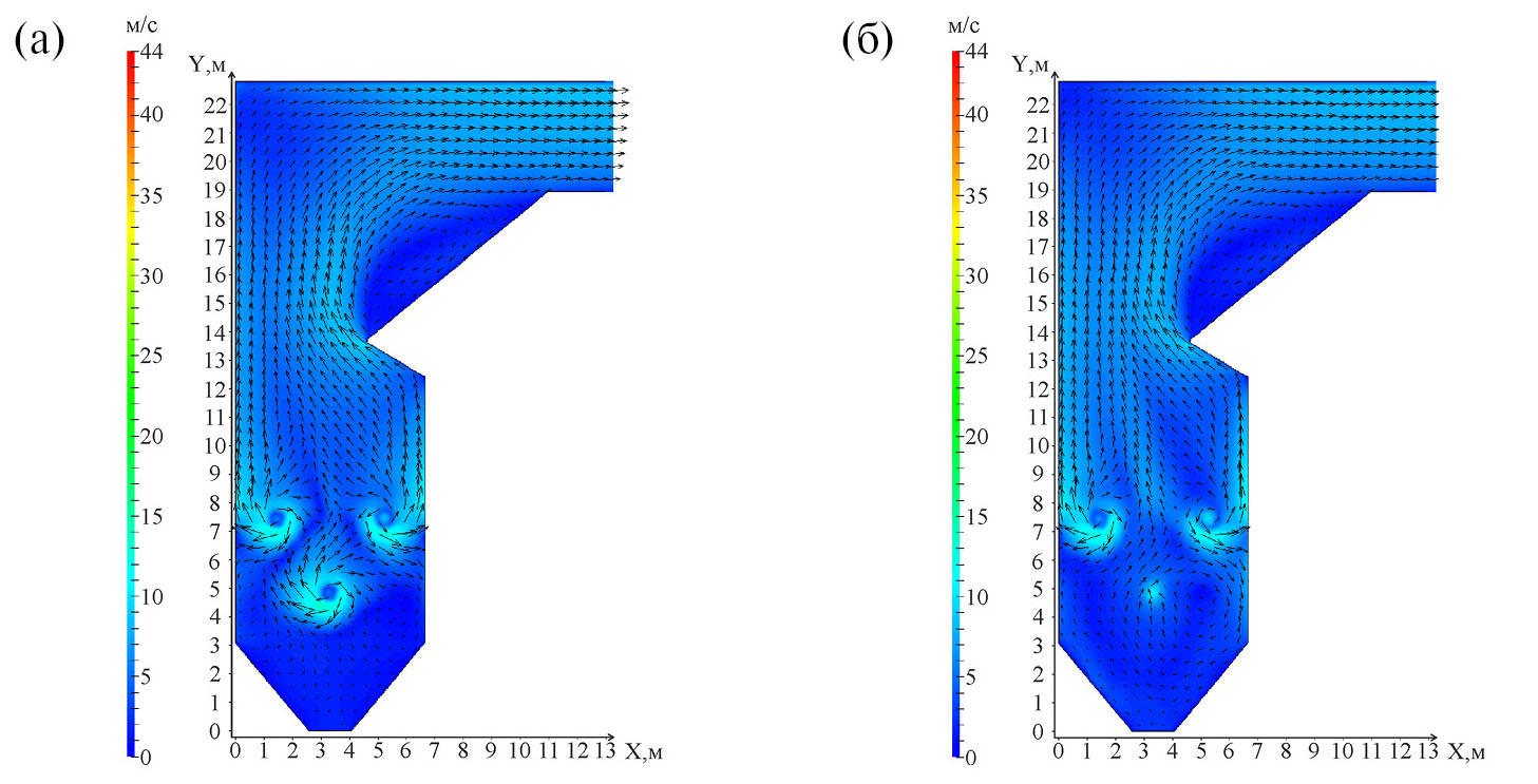 Рис. 3. Векторное поле скоростей в поперечном сечении по оси топочной камеры (м/с): (а) MLU; (б) QUICK.