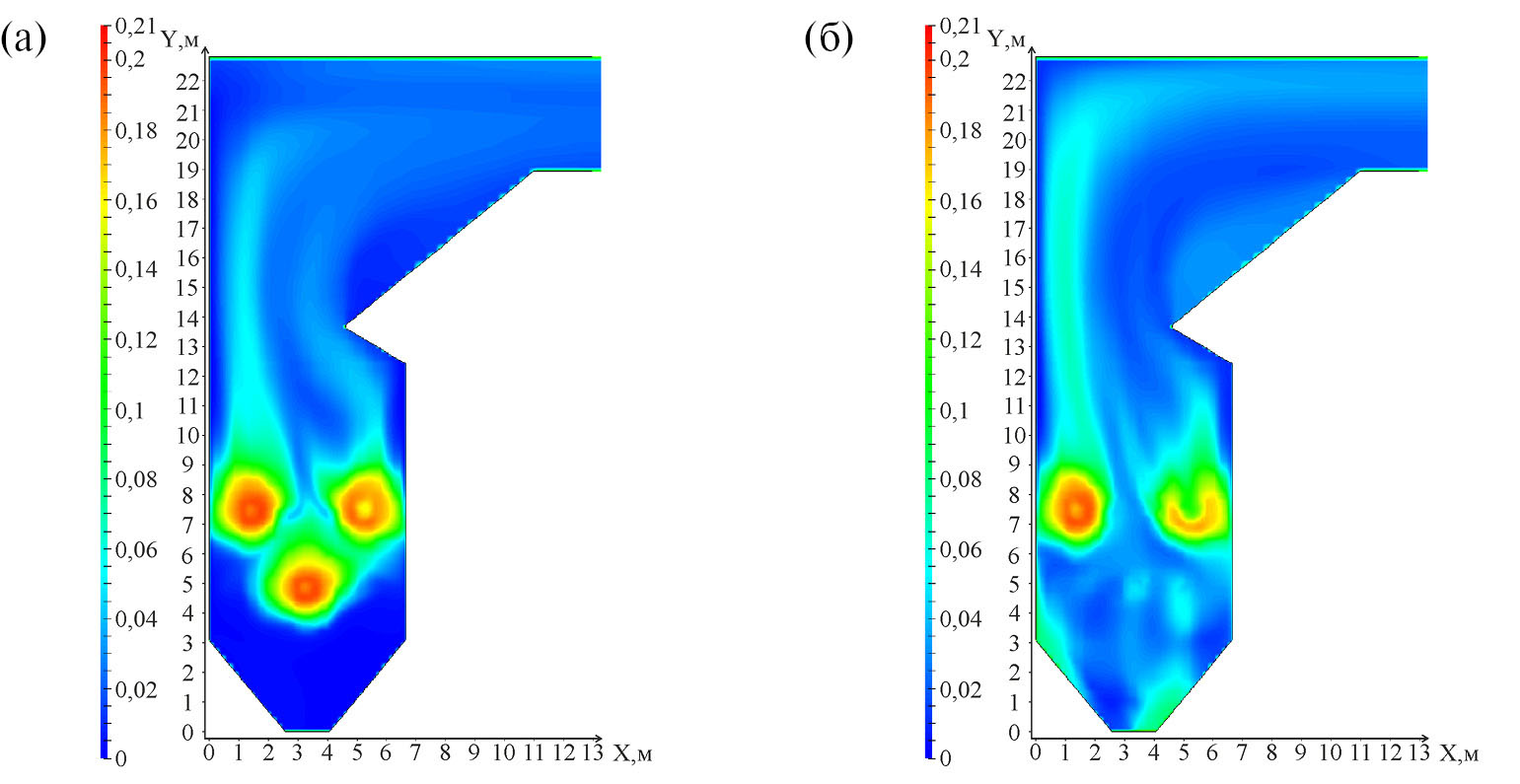 На рис. 2 и 3 представлены данные о скоростях потоков и векторах скоростей в продольных и поперечных сечениях топки. Эти результаты показывают, что внутри топки наблюдается подъемное движение с достижением 8…12 м/с. Это подтверждает, что происходит эффективное перемешивание воздушных потоков внутри горелочных устройств. Также на рис. 2 и 3 видно распространение потоков, которые формируются при подаче пылевоздушной смеси и вторичного воздуха на выходе из горелочных устройств. Горелочные струи формируют форму факела в соответствие с направлением и параметром крутки в вихревых горелочных устройствах. При этом стоит отметить, что при организации расчета по схеме MLU формирование закрученных потоков происходит более активно, нежели чем при расчете с применением схемы аппроксимации QUICK (рис. 2, 3). В частности, при схеме QUICK наблюдается существенная раскрутка факела на выходе из горелочных устройств, и это приводит к малому проникновению горелочных струй по ширине топочной камеры и к значительным зонам обратных токов вдоль оси горелок (рис. 3). Из-за этого на рис. 2б не наблюдается сформированный закрученный аэродинамический поток от нижней горелки в центральном сечении по продольной оси топки.