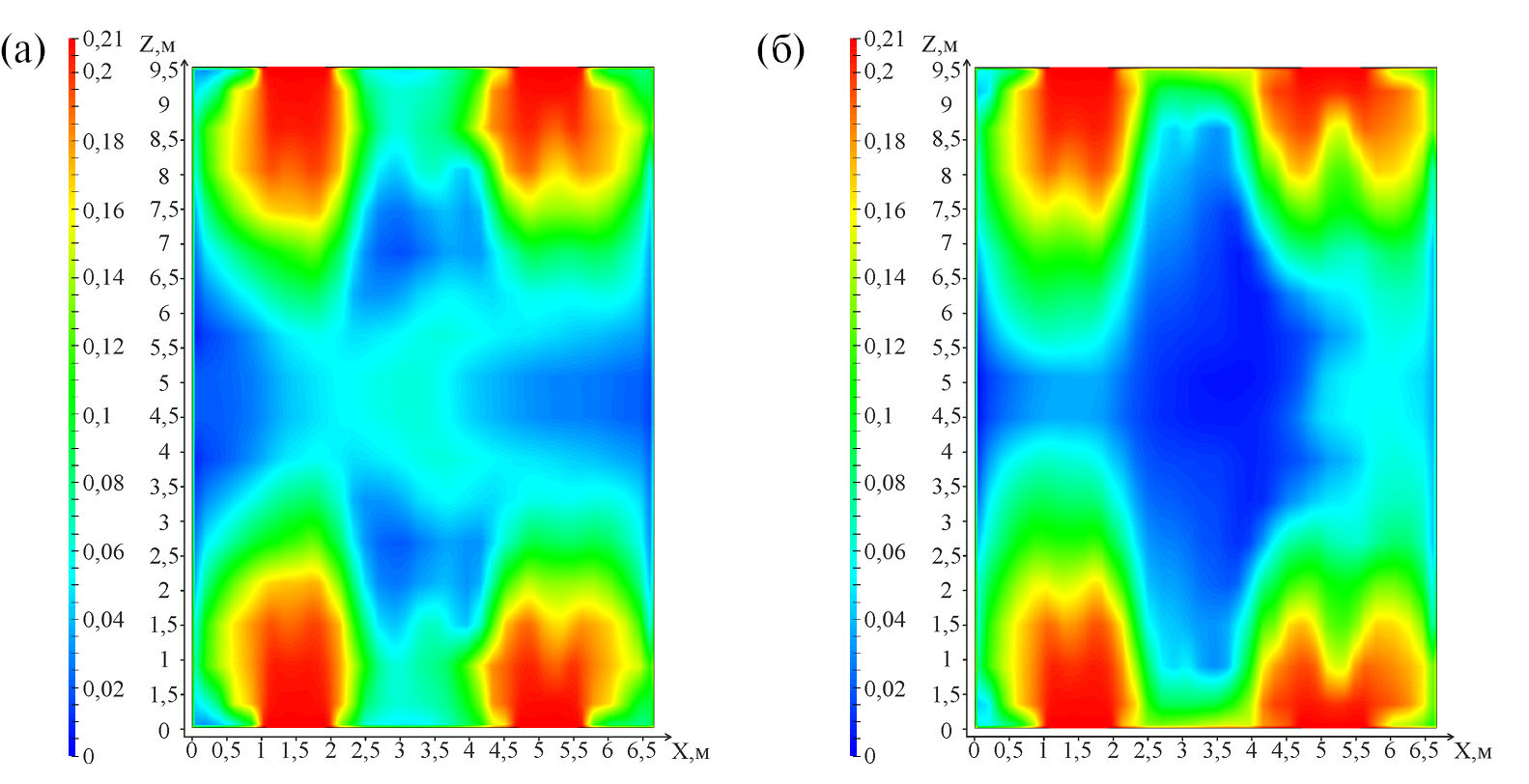Рис. 7. Концентрация О2 в горизонтальном сечении по оси верхнего яруса горелочных устройств (%): (a) MLU; (б) QUICK.