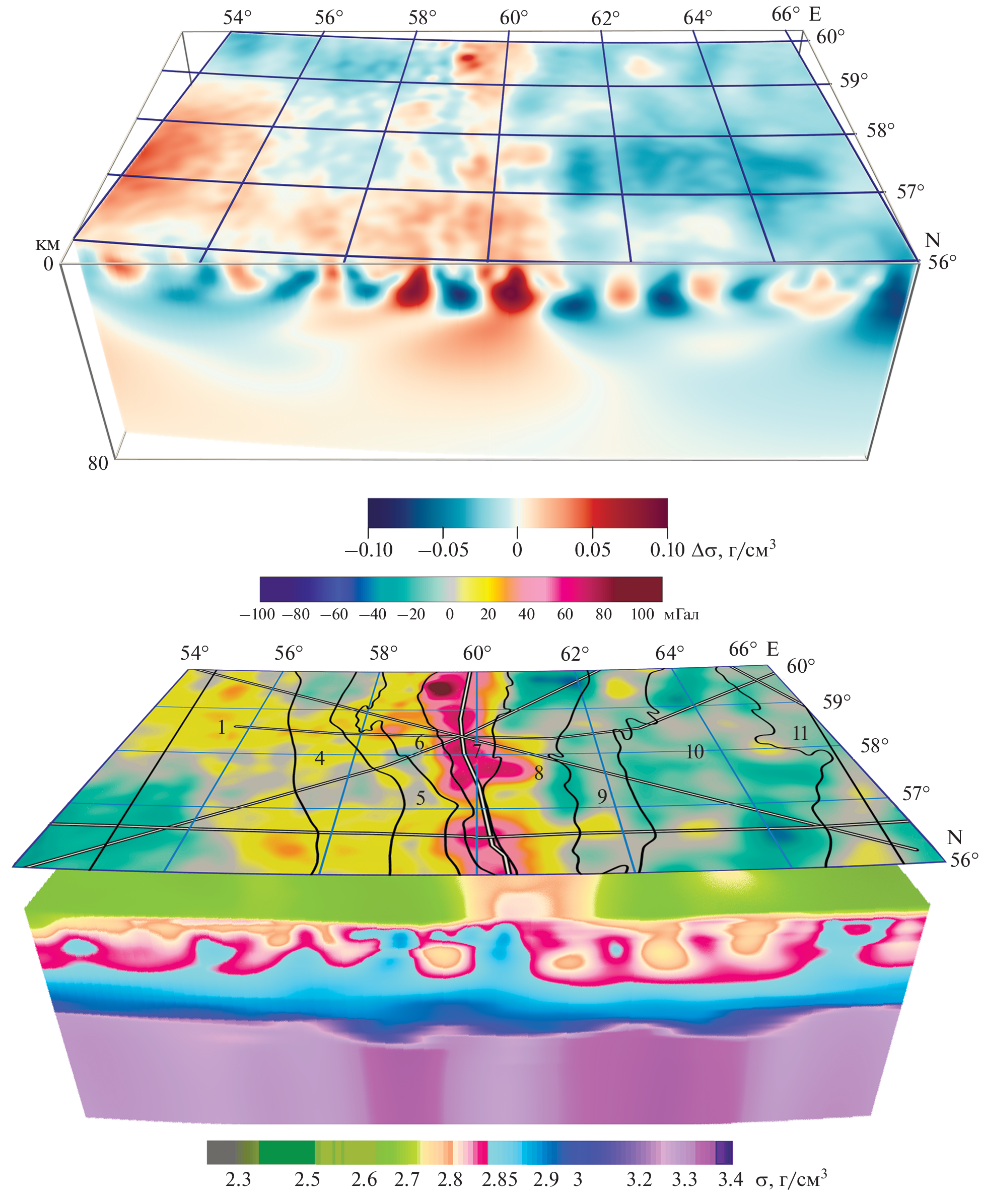 For the Middle and North Urals segments and adjacent territories of the East European Platform and West Siberian Plate (within the graticular trapezoid with geographic coordinates 53–65° N, 48–72° E), ten deep seismic sounding (DSS) profiles were reprocessed using two-dimensional (2D) seismic tomography method, and gradient sections of crustal velocities were constructed in the form of grid functions. In the same format, density sections were constructed. The coefficients of density–velocity empirical correlation were calculated using the solution algorithm of 2D inverse problem of gravimetry. The method and calculation technology of a three-dimensional (3D) density distribution with tying to 2D data from reference seismic sections are embedded in the procedure of quantitative interpretation of potential fields with construction of 3D geophysical models. A stable solution of the 3D inverse problem of gravimetry is sought on the correctness set of the family of horizontal layers with 2D density distribution.