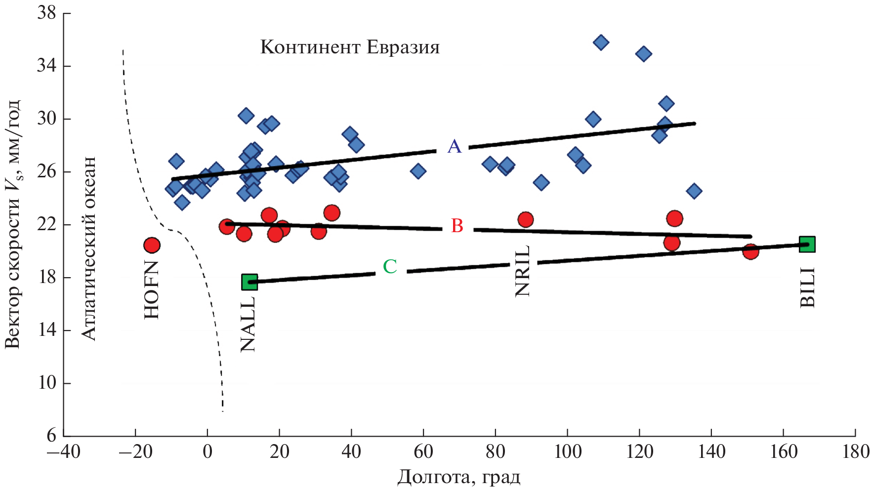 Over the whole area of the Eurasian lithospheric plate considered in the paper —rom the Atlantic to the Pacific Ocean—the velocity vectors of the horizontal eastward displacements of GPS sites form a gentle, smooth, huge arc, convex towards the north. Three relatively narrow bow-shaped bands can be distinguished within the arc. The southernmost band, most provided with measurement data (bow-shaped band A in this paper) is discussed in detail in (Shevchenko et al., 2021). The direct, real results of the published geodetic measurements have shown that the length of this band increases by 5 to 10 mm annually. The arc is lengthening. In the cited paper, we considered and rejected five interpretations of this lengthening, which are based on the idea of external action of the above bow-shaped band on the rocks of the Earth’s crust/lithosphere. The most probable cause of the elongation seems to be the internal process of the increase in the volume of these rocks within the band due to the supply of the additional mineral material into these rocks by the deep fluids and its subsequent crystallization. In this paper, we present the results of similar geodetic measurements in other two bow-shaped bands, B and C. It turns out that bow-shaped band C located to the north of the other bands, is lengthening (and at a similar rate) as band A located to the south of the other bands. At the same time, bow-shaped band B, which has an intermediate position between bands A and C, is moving eastward without lengthening. Geodetic measurements in the axial part of the Mid-Atlantic Ridge in the Iceland island suggest that the general expansion of the Atlantic Ocean and the corresponding eastward motion of the Eurasian lithospheric plate are related to the injection of plastic magmatic wedges (of basic composition) in the axial, rift zone of the ridge. Against the background of this general eastward motiont of the lithospheric plate, its constituent parts (the bow-shaped bands A and C are markers of these parts) are moving in the same eastward direction with a velocity increasing from west to east. We attribute this increase in the velocity and the corresponding lengthening of the two bands to the above inflow of the additional mineral material and its subsequent crystallization.