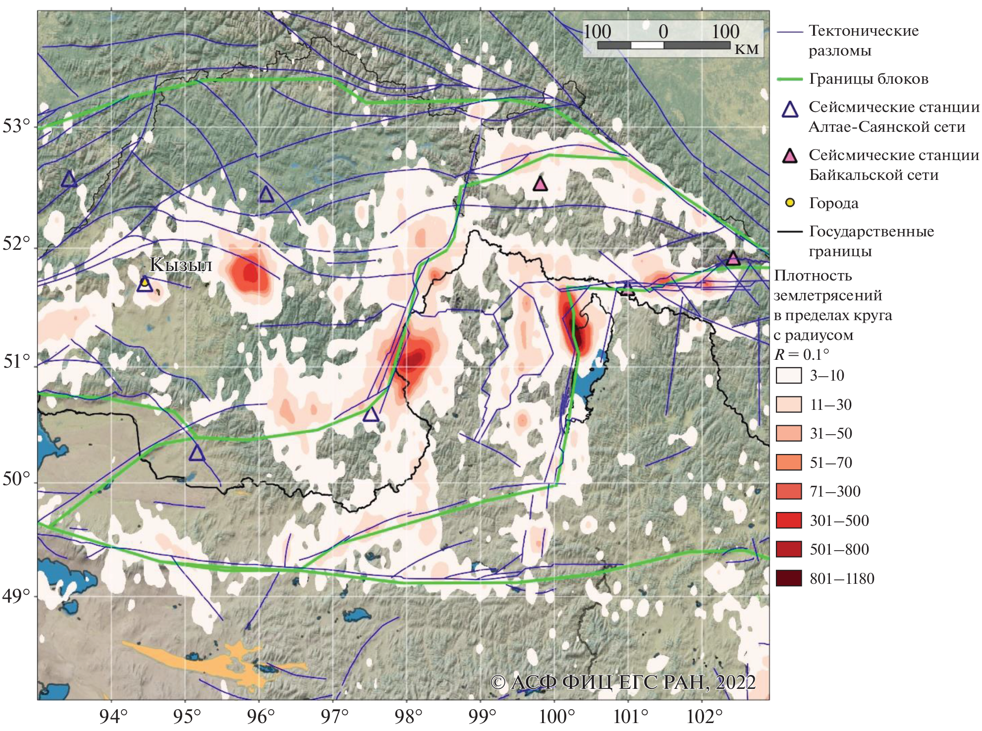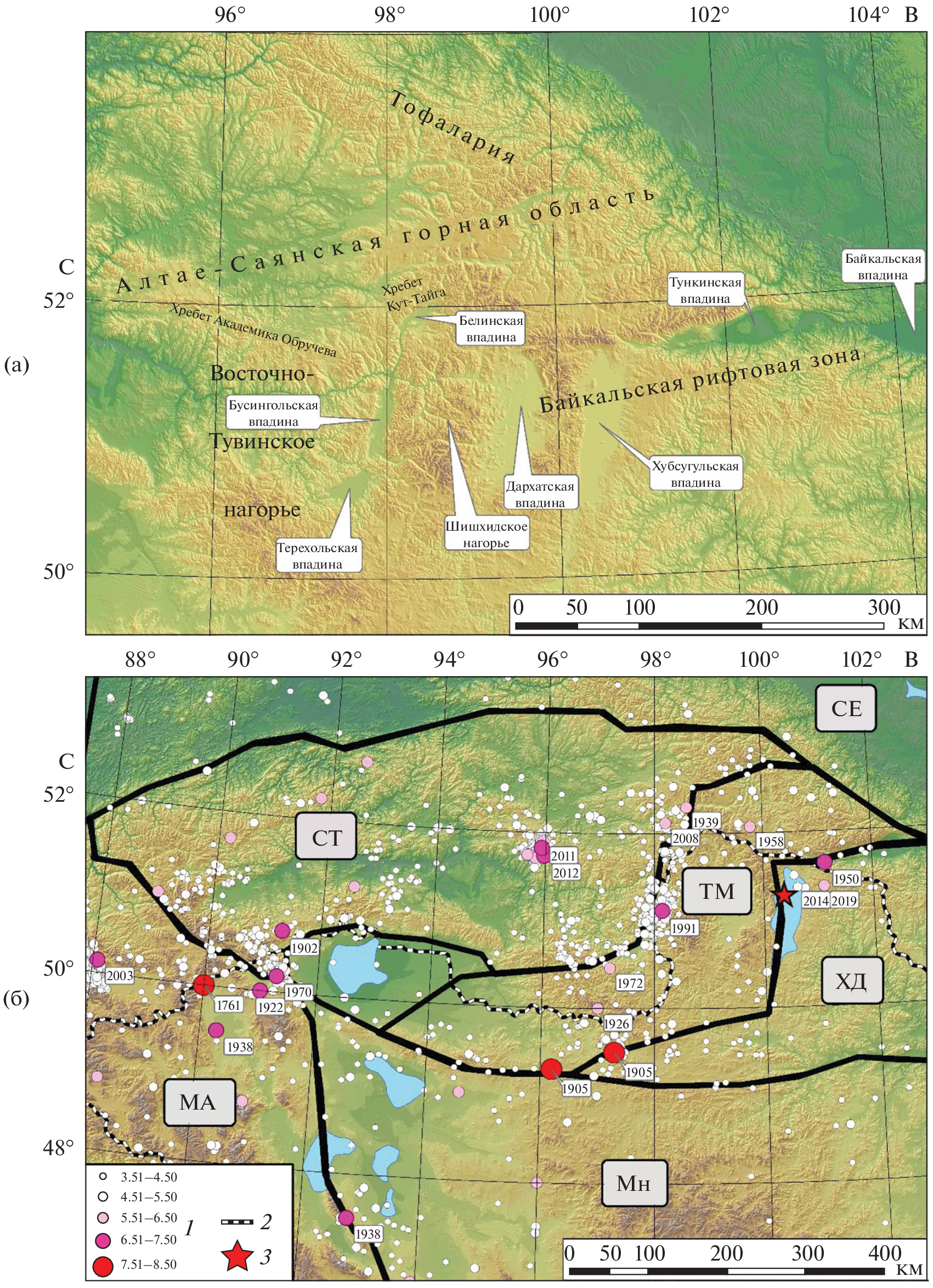 —The paper presents the studies of the Khuvsgul earthquake on January 11, 2021 at 21:32 UTC (January 12, 2021 at 05:32 local time), MW = 6.7, ML = 6.9, and the seismicity structure in the aftershock period for the Altai-Sayan mountain region and the Baikal rift zone, where the epicenter of this earthquake was located. Two faults are seismically activated, diverging from the southern end of the aftershock area at an acute angle: one in the northeast and one in the northwest direction, as well as transverse faults between them. According to the epicenter position and studies of the source area by other authors, the main event corresponds to the northeastern fault, and large aftershocks occurred at the junction of the northwestern fault with transverse faults feathering from the east. The main event was immediately followed by a series of large aftershocks, the strongest of which occurred on March 31, 2021 with ML = 6.2 and on May 3, 2021 with ML = 6.4. Spatial changes in the seismic regime of the aftershock region led to the predominant activity of its southern end. The junction area of the collisional structures of the Altai-Sayan folded zone and the rift structures of the Baikal depressions system is distinguished in seismicity as a block structure with increased seismicity near the block boundaries. First of all, these are the Tuva-Mongolian block and the eastern part of the Sayano-Tuva block. After the Khuvsgul earthquake of 2021, a block structure with the activation of the epicentral zones of the 1991 Busingol earthquake, the 2011–2012 Tuva earthquakes, and other structures seismically active until 2021 has increased seismic activity. It is proved that the 2014 Khubsgul earthquake occurred under the basin of the same name and is associated with other faults than the 2021 earthquake and is not a direct precursor of the 2021–2022 activation.