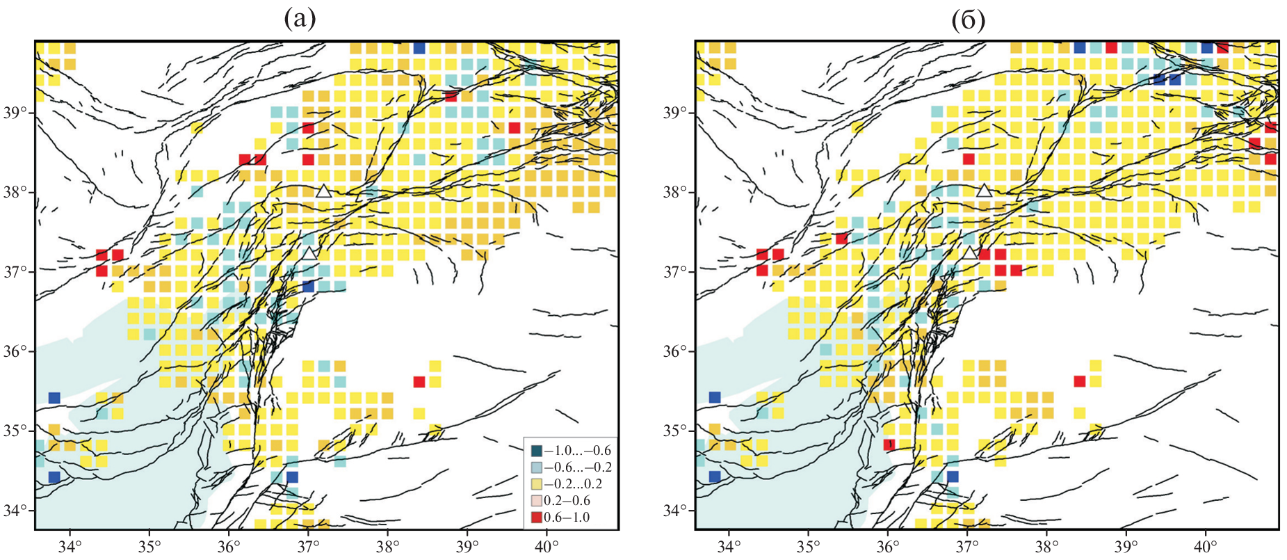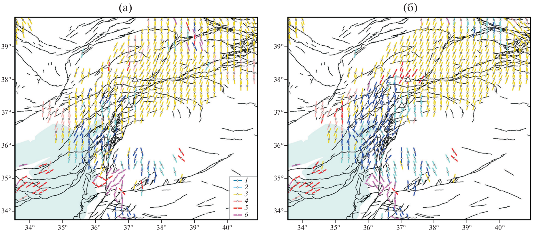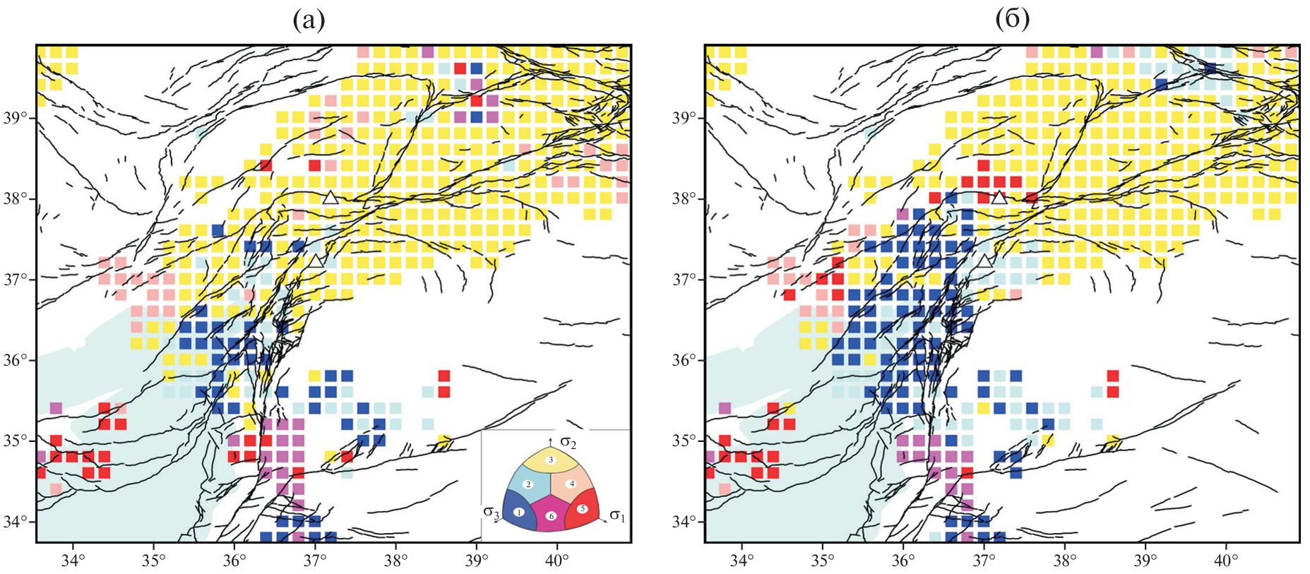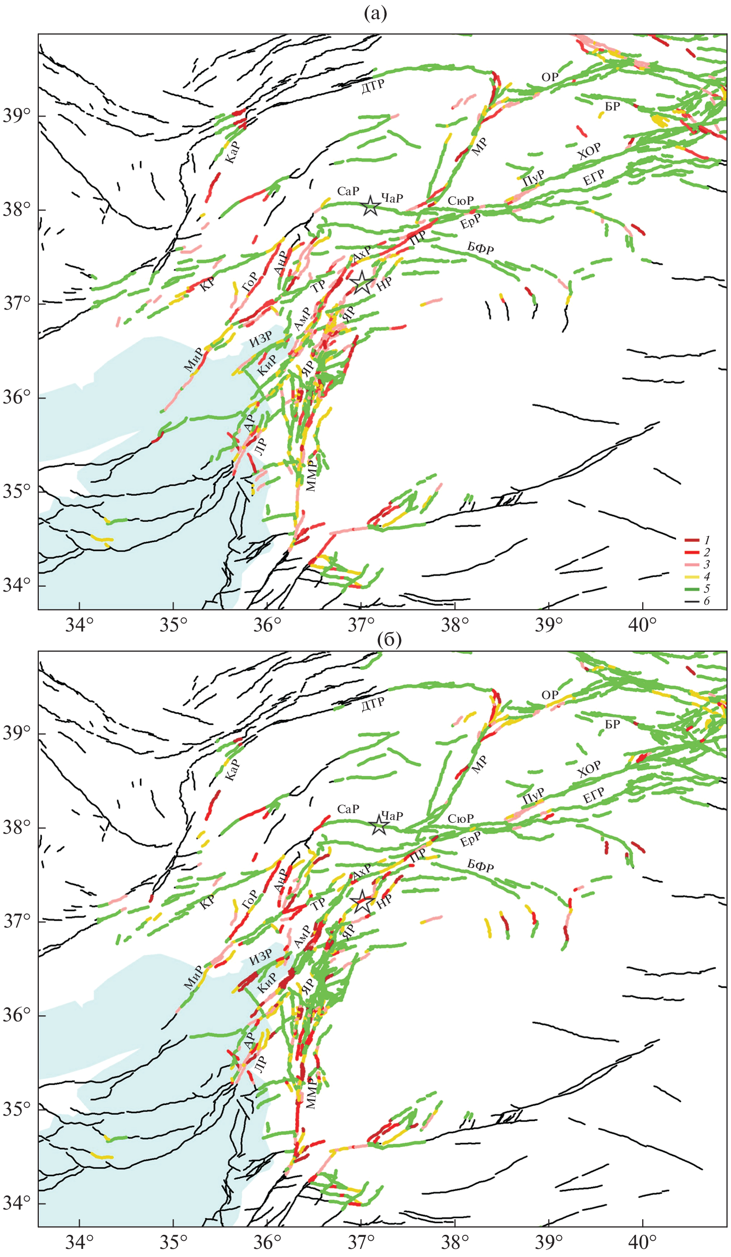 Abstract—The results of the tectonophysical reconstruction of stresses in the crust of Eastern Anatolia, obtained from the analysis of data on earthquake focal mechanisms, have shown that a significant restructuring of the stress state has occurred here in the last 20 years. It was largely confined to the southern and southwestern sectors of the region, covering hundreds of kilometers along the East Anatolian Fault. The data obtained from tectonophysical monitoring not only on the orientation of principal stresses, but also on their normalized values made it possible to calculate Coulomb stresses on faults. The results of fault zoning by intensity and sign of these stresses helped identify both hazardous sections close to the limit state and safe sections with negative Coulomb stress values. It has been established that in the region of the source of the first strong Pazarcık earthquake, which had a complex structure (three segments), there were extended sections with a critically high Coulomb stress level, separated by zones with low and even negative values of these stresses. The epicenter of this earthquake was located on the echelon fault within a section (first segment) with a high Coulomb stress level. The source of the second strong Elbistan earthquake was located on a fault with negative Coulomb stresses. The conducted analysis shows that this second Turkey earthquake may have been caused by stress changes that occurred in the crust of the region after the first strong earthquake. The research results show that Coulomb stresses in systems of closely located and differently oriented faults may be prone to sudden changes during the development of the earthquake on one of hazardous sections.