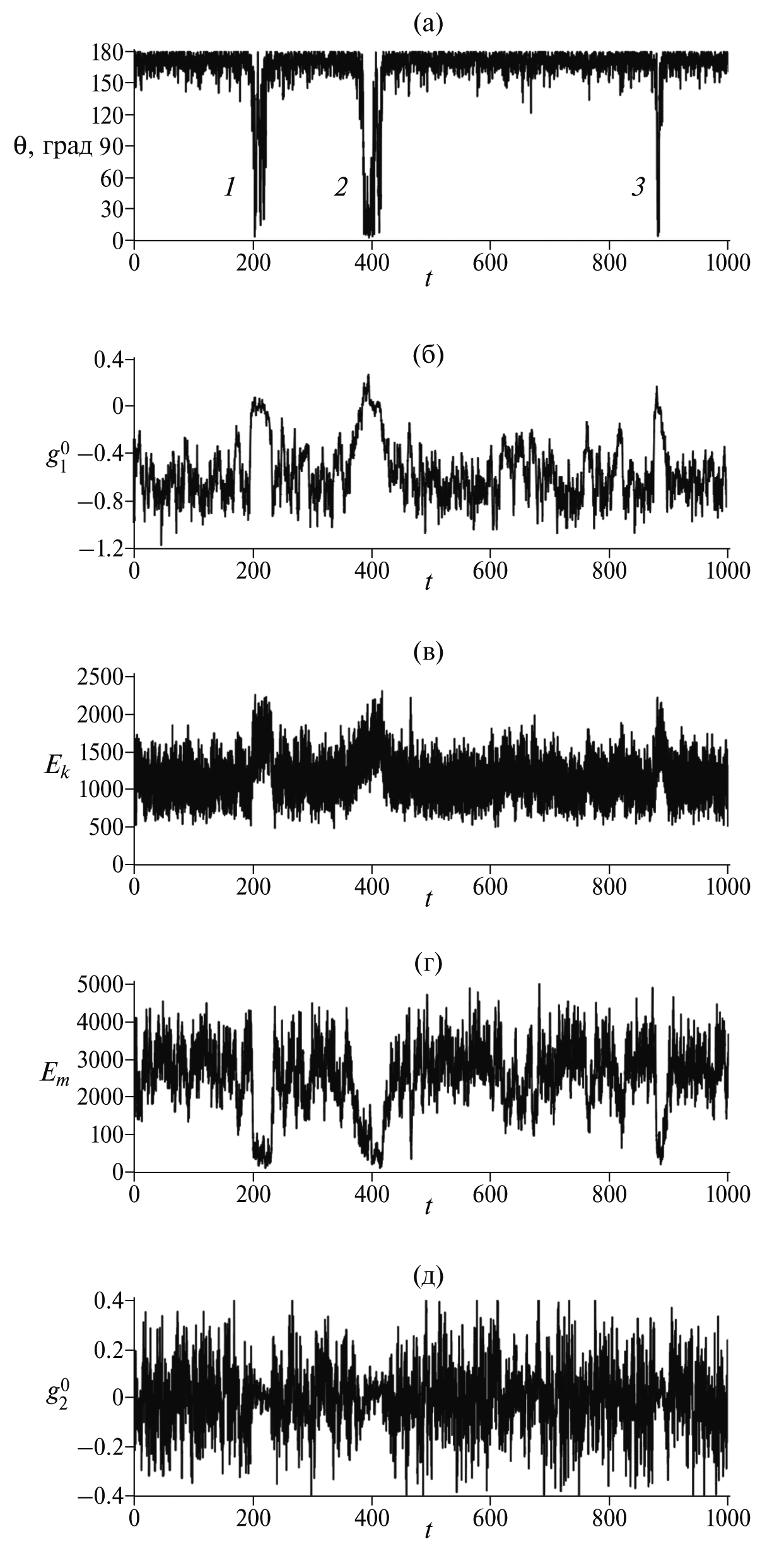 Рис. 1. Зависимость от времени t угла отклонения осевого диполя от географической оси (а), амплитуды осевого диполя (б), кинетической Ek (в) и магнитной Em (г) энергий, и осесимметричного квадруполя (д) для Ra = 4 · 10–5. Цифрами отмечены наиболее яркие экскурсы.