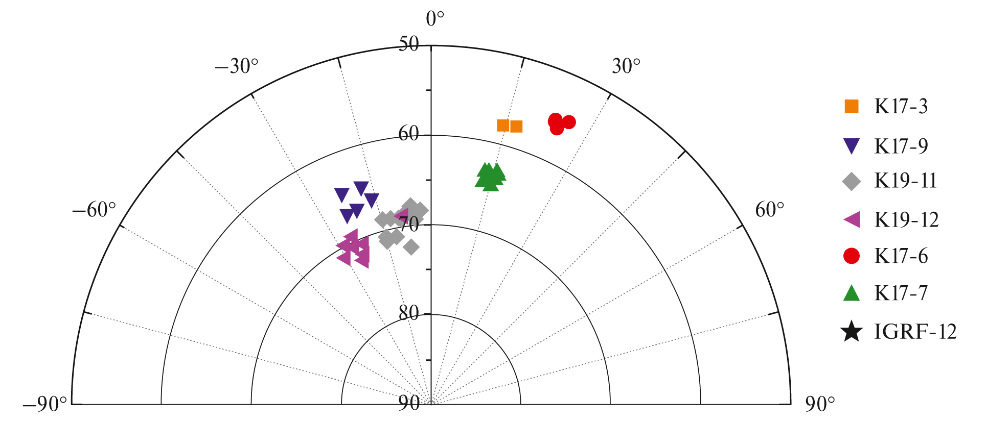 Склонение и наклонение, определенные по 5 дублям обр. К17-6 (поток Л1), равны Dдр = 24.4° и Jдр = 55.6°, для образцов К17-3 (2 дубля) и К17-7 (9 дублей) потока Л2 Dдр = 15.1°, Jдр = 62.8°. Значения направления магнитного поля во время образования потоков Л1 и Л2 оказались близки, склонение восточное.