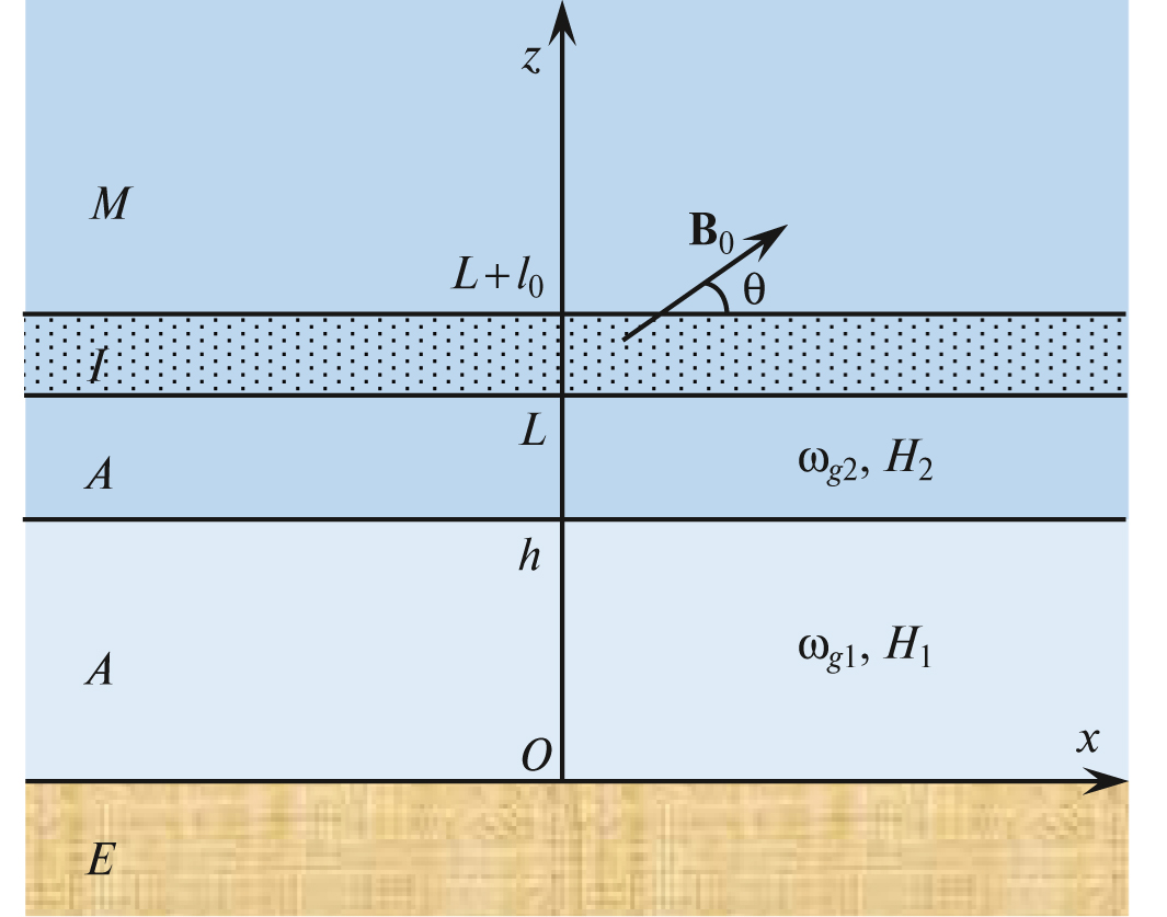 Предположим, что вектор невозмущенного геомагнитного поля лежит в вертикальной плоскости x, z и образует угол θ (наклонение) с осью x, как показано на рис. 1. Акустическая волна распространяется вверх от поверхности земли, а ее горизонтальный волновой вектор направлен вдоль оси x, т.е. в меридиональном направлении. Теперь сформулируем основные уравнения и граничные условия данной задачи. Как и ранее полагаем, что зависимость от времени и координаты x определяется множителем Линеаризованные уравнения Максвелла для Е-слоя ионосферы, занимающей область имеют вид: