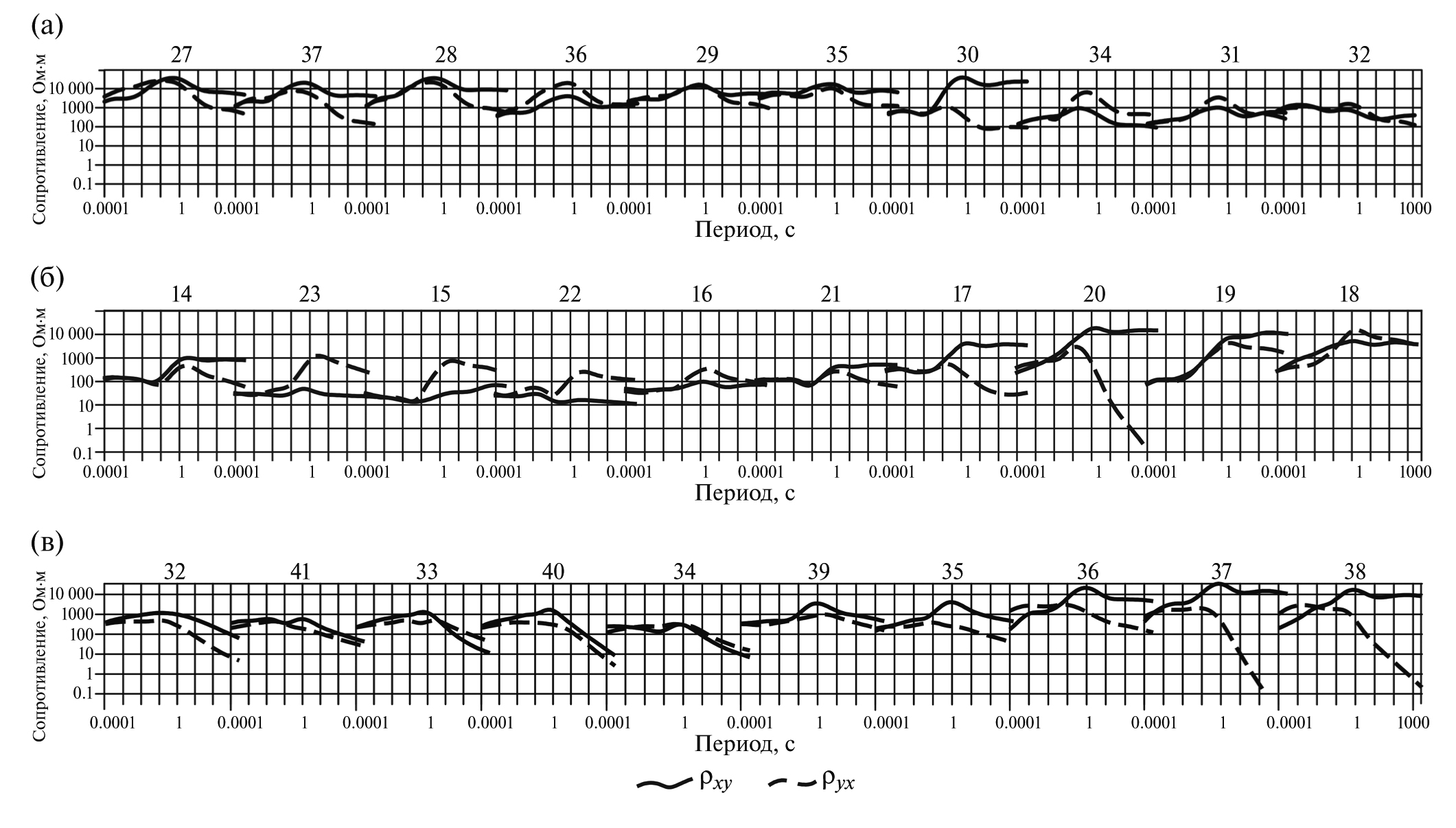 Анализ амплитудных кривых, полученных в результате полевых измерений, показал, что на них не наблюдается значительного расхождения продольной и поперечной кривых даже на пунктах зондирования, расположенных вблизи берега моря. На профиле ДП ближайший пункт наблюдения расположен в нескольких сотнях метрах от берега моря, на профиле СЗ на расстоянии 2.5 км, а на профиле АВ – около 100 м. Продольная и поперечная кривые имеют близкую друг другу форму и близки по уровню сопротивлений. На некоторых береговых точках профиля АВ (№ 37 и № 38) и профиля СЗ (№ 20) форма кривых явно отличается от эффекта, вызванного влиянием моря, и соответствует влиянию проводящего разлома (рис. 2).