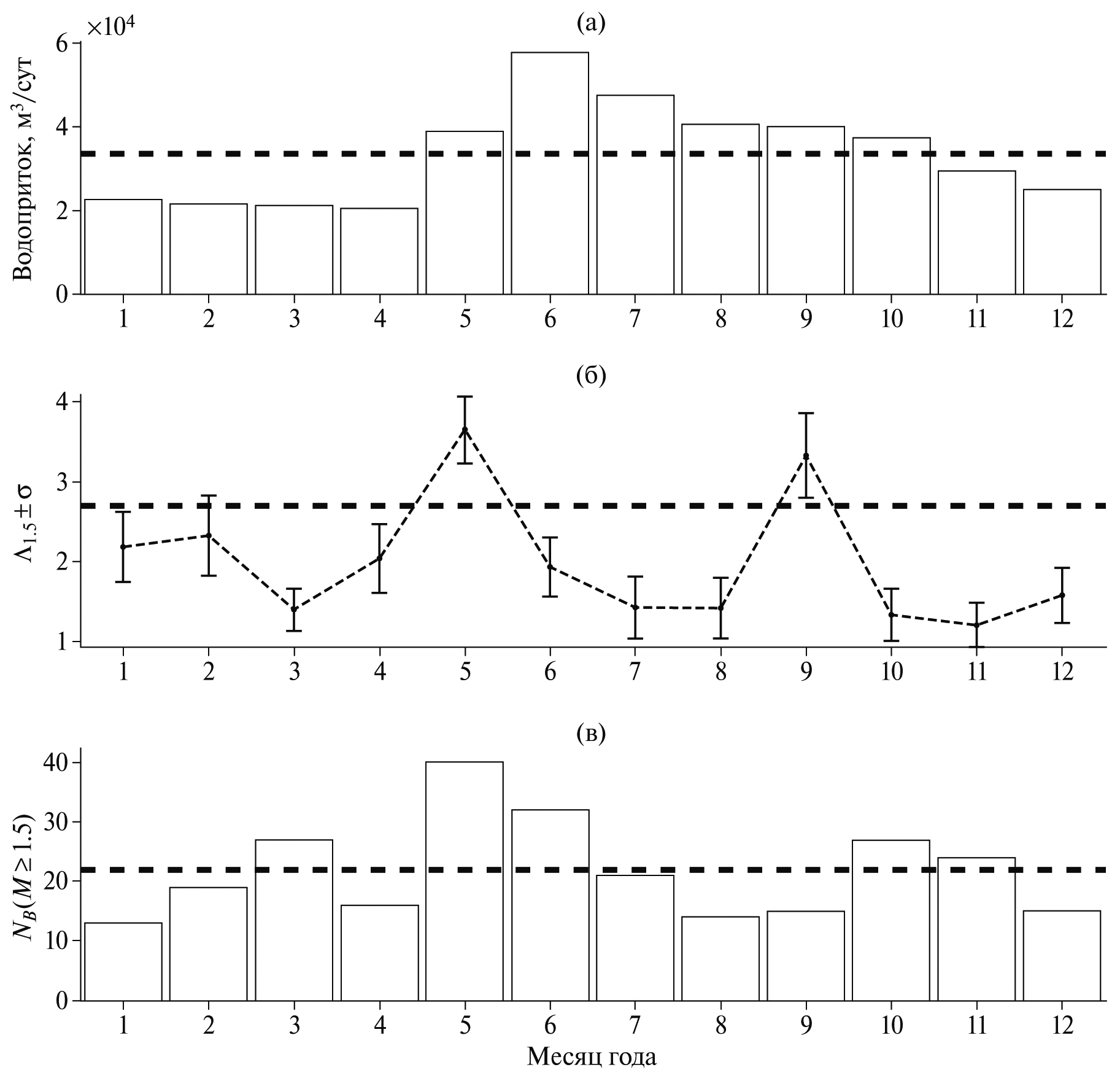 Рис. 4. Среднемесячные вариации уровня обводненности среды и значений продуктивности землетрясений на месторождениях Хибинского массива: (а) – средний водоприток (м3/сут), пунктирная прямая показывает среднее значение; (б) – значение параметра распределения продуктивности Λ1.5 ± σ (стандартная ошибка), пунктирная прямая показывает значение Λ1.5 = 2.7, оцененное по всем данным [Баранов и др., 2020]; (в) – число фоновых землетрясений (NB) с M ≥ 1.5, пунктирная прямая показывает среднегодовое значение (21.9).