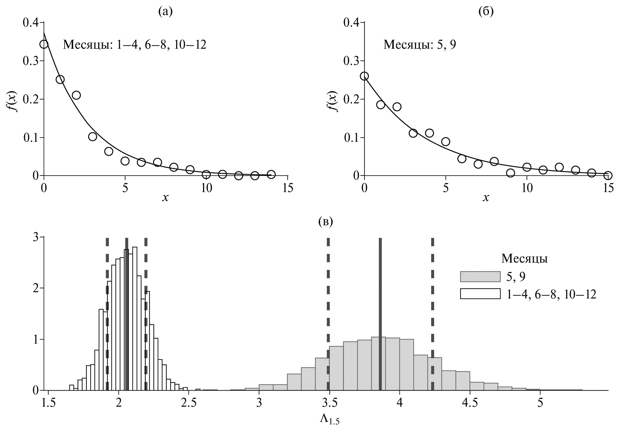Рис. 6. Распределения продуктивности землетрясений на месторождениях Хибинского массива мае, сентябре (б) и в остальные месяцы года (а): кружки – фактические данные; сплошная линия – плотность экспоненциального распределения; (в) – распределения ошибок оценок параметров Λ1.5, полученные бутстрэп методом: сплошные вертикальные черные линии – значения продуктивности Λ1.5 для соответствующих периодов; пунктирные черные прямые – значение продуктивности Λ1.5 ± σ для соответствующих периодов.