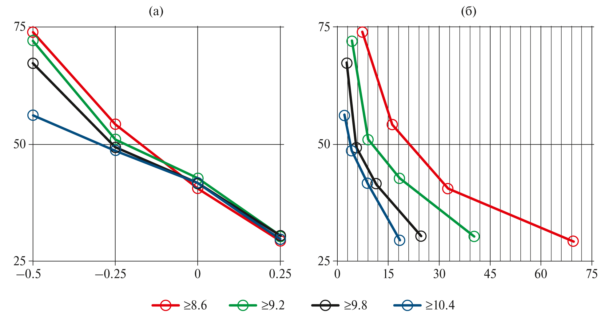 Локальная плотность α при увеличении значения связанности β – растет. При минимальном β = –0.5 и максимальном β = 0.25 величина α изменяется примерно в 10 раз. От 7.4 до 69.5, от 4.4 до 40.3, от 2.9 до 24.7 и от 2.1 до 18.4 для эпицентров с KР ≥ 8.6, 9.2, 9.8 и 10.4 соответственно.