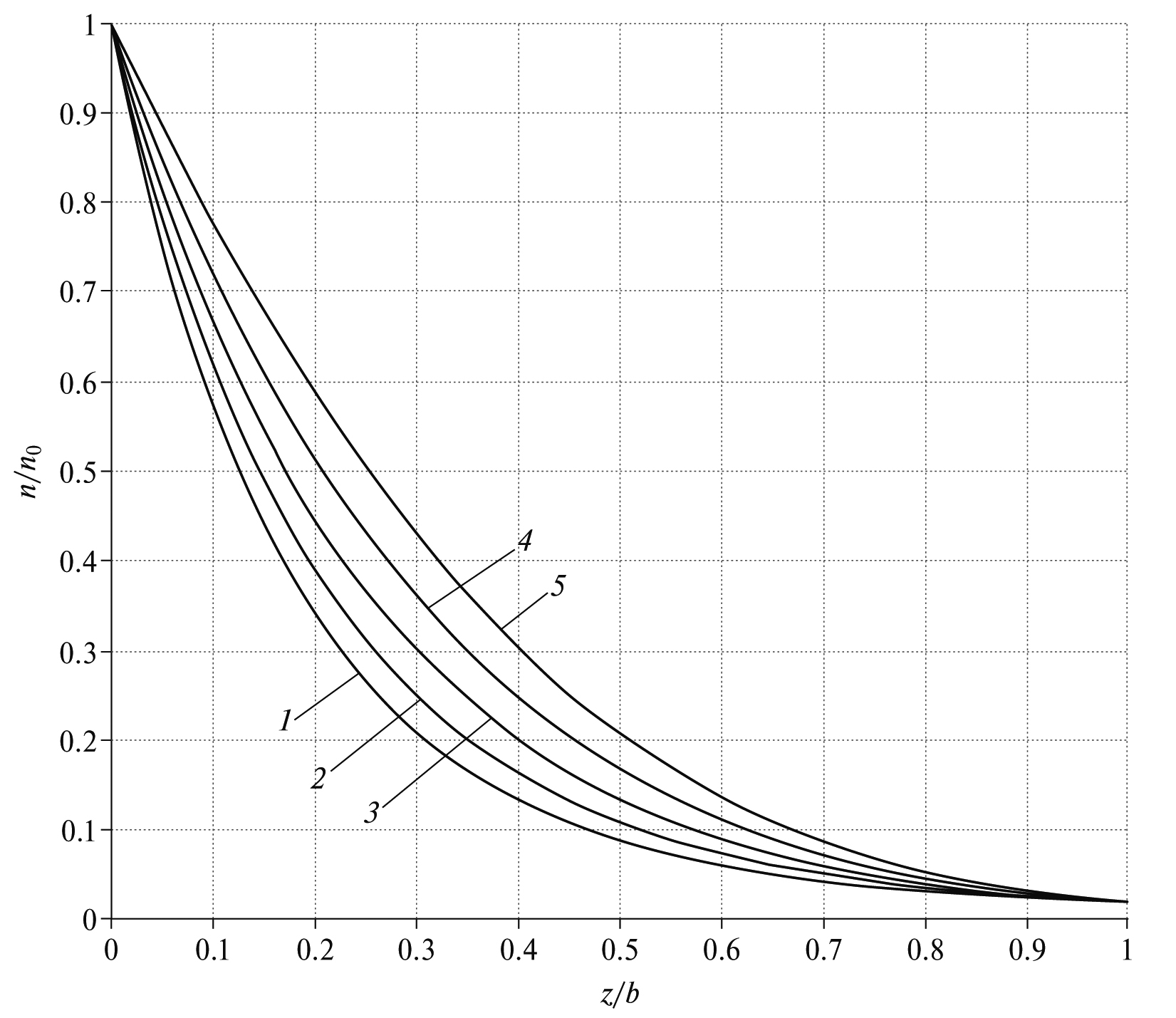Для иллюстрации полученных закономерностей проведем численные расчеты при следующих значениях параметров: м/с, мин, км, км и м. Для этих значений параметров находим, что т.е. указанное выше ограничение приблизительно выполняется. На рис. 2 показана безразмерная зависимость концентрации атмосферных частиц от высоты для различных значений x в момент времени мин, когда скорость становится равной нулю, а направление движения газа меняется на противоположное. Из решения (10) следует, что в этот момент времени отклонение концентрации частиц от первоначального значения достигает максимального значения. Невозмущенное высотное распределение концентрации, отвечающее значению показано линией 3. Из рис. 2 видно, что при отрицательных значениях x (линии 1 и 2) распределение концентрации уменьшилось, а при положительных (линии 4 и 5) – увеличилось. Это связано с тем, что в предшествующие моменты времени воздушные потоки были направлены сверху вниз при и снизу вверх при как это схематически показано на рис. 1. Следовательно, вблизи земли при воздушные массы с большим содержанием частиц замещаются опускающимися вниз воздушными массами с более низким содержанием частиц, а при – наоборот, т.е. вверх поднимается воздух с бóльшим значением концентрации.
