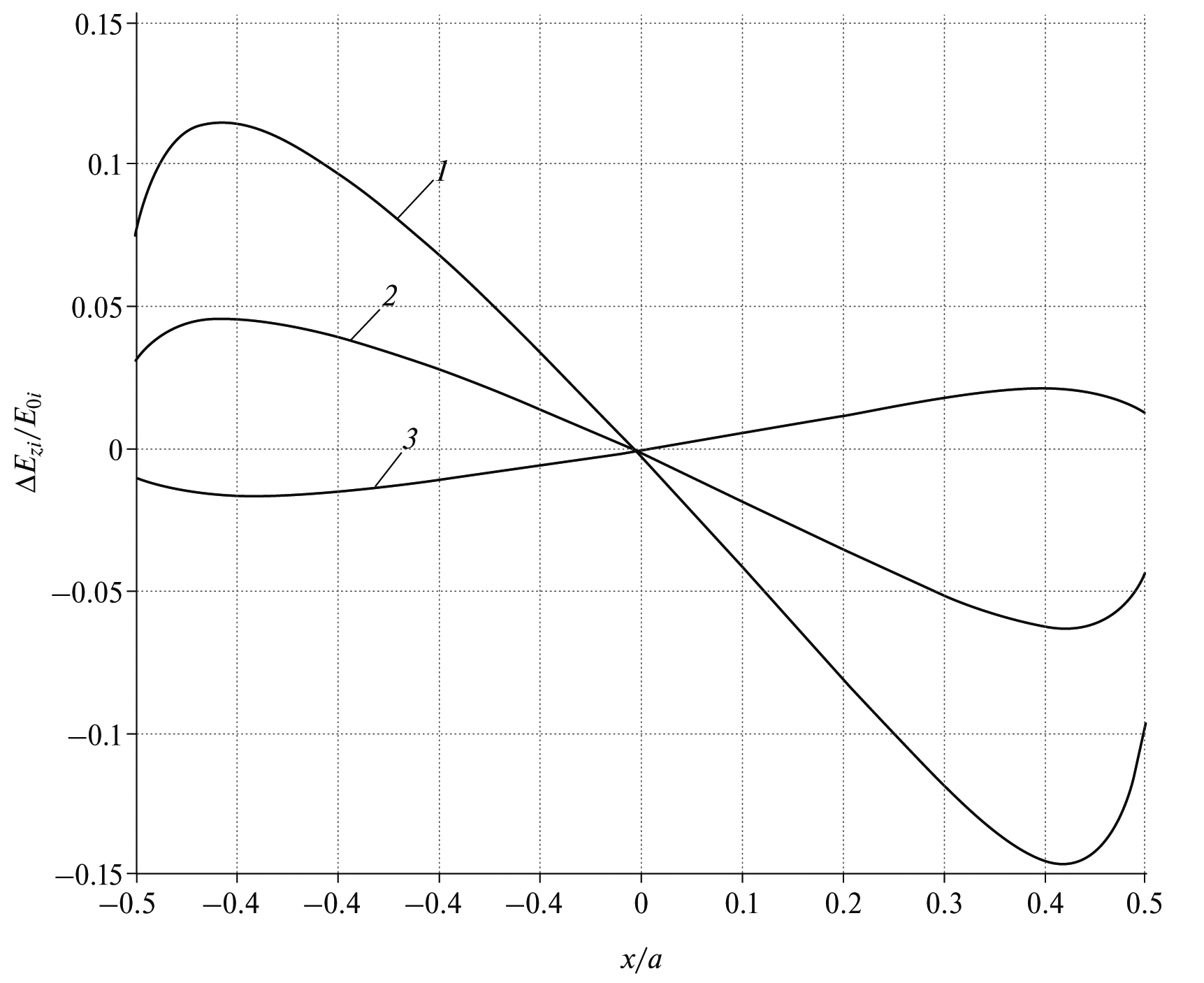 Предыдущий анализ показал, что возмущения электрического поля максимальны вблизи боковых границ возмущенной области и, в частности, вблизи точек с абсциссами Для этих крайних значений x можно получить явную зависимость от координат. После подстановки в уравнение (7) интеграл в этом уравнении упрощается и его можно взять. Тогда после ряда преобразований получаем следующее явное выражение для
