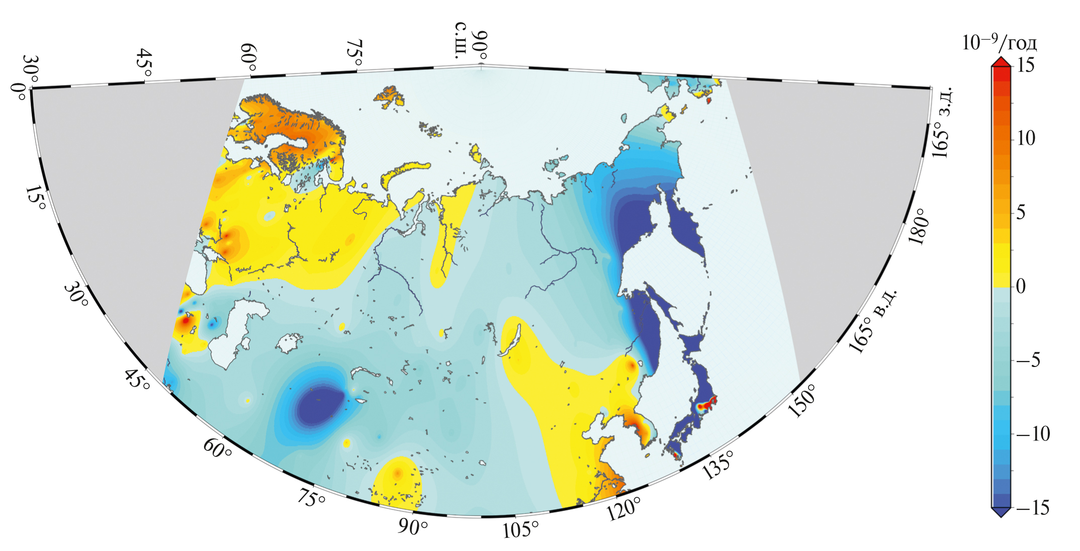 В дальневосточной части РФ многие пункты расположены вблизи границ тектонических плит, где происходят активные межплитовые деформационные процессы, поэтому в этих регионах модели блокового движения тектонических плит не применимы, что проявляется в разнонаправленном характере невязок скоростей и заметном увеличении векторов, в особенности для пунктов Южно-Сахалинск и Петропавловск-Камчатский.