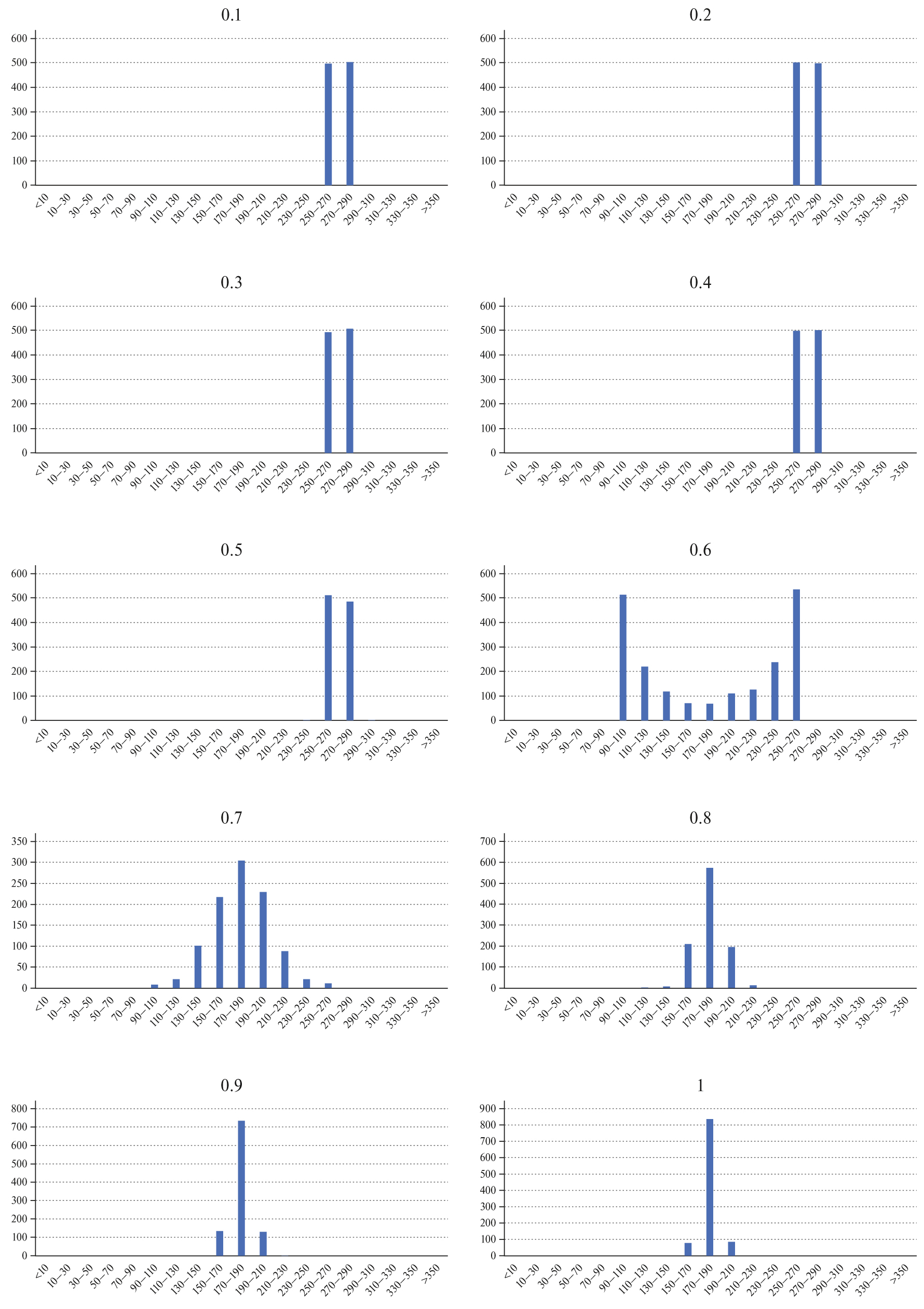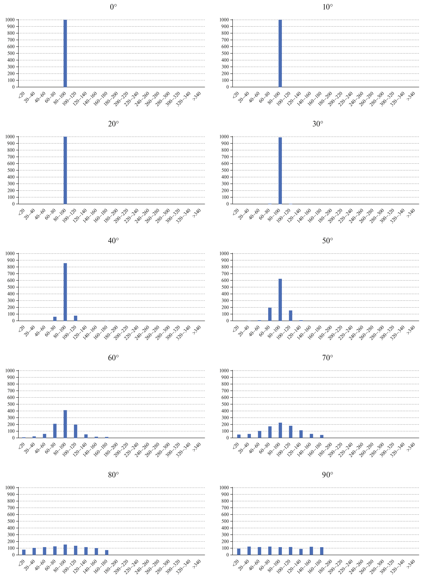 Характер этой зависимости иллюстрируется гистограммами, приведенными на рис. 1. Как видно из этих гистограмм значения параметра довольно устойчивы в интервале широт от 10 до 50°: вероятность того, что у случайно взятой выборки эти значения попадут в интервал 170–180° практически всегда не менее 75–80%, а в интервале 150–210° близка к единице. Это означает, что направление вытянутости распределения палеомагнитных направлений, по крайней мере в указанном интервале широт можно использовать как критерий соответствия этих направлений модели TK03. При более высоких широтах гистограммы “расползаются”, иллюстрируя быстрое нарастание неопределенности, при определении параметра и, соответственно, резкое уменьшение его полезности для сопоставления с моделью. Это связано, очевидно, с уменьшением вытянутости распределений модельных палеомагнитных направлений при увеличении широты.