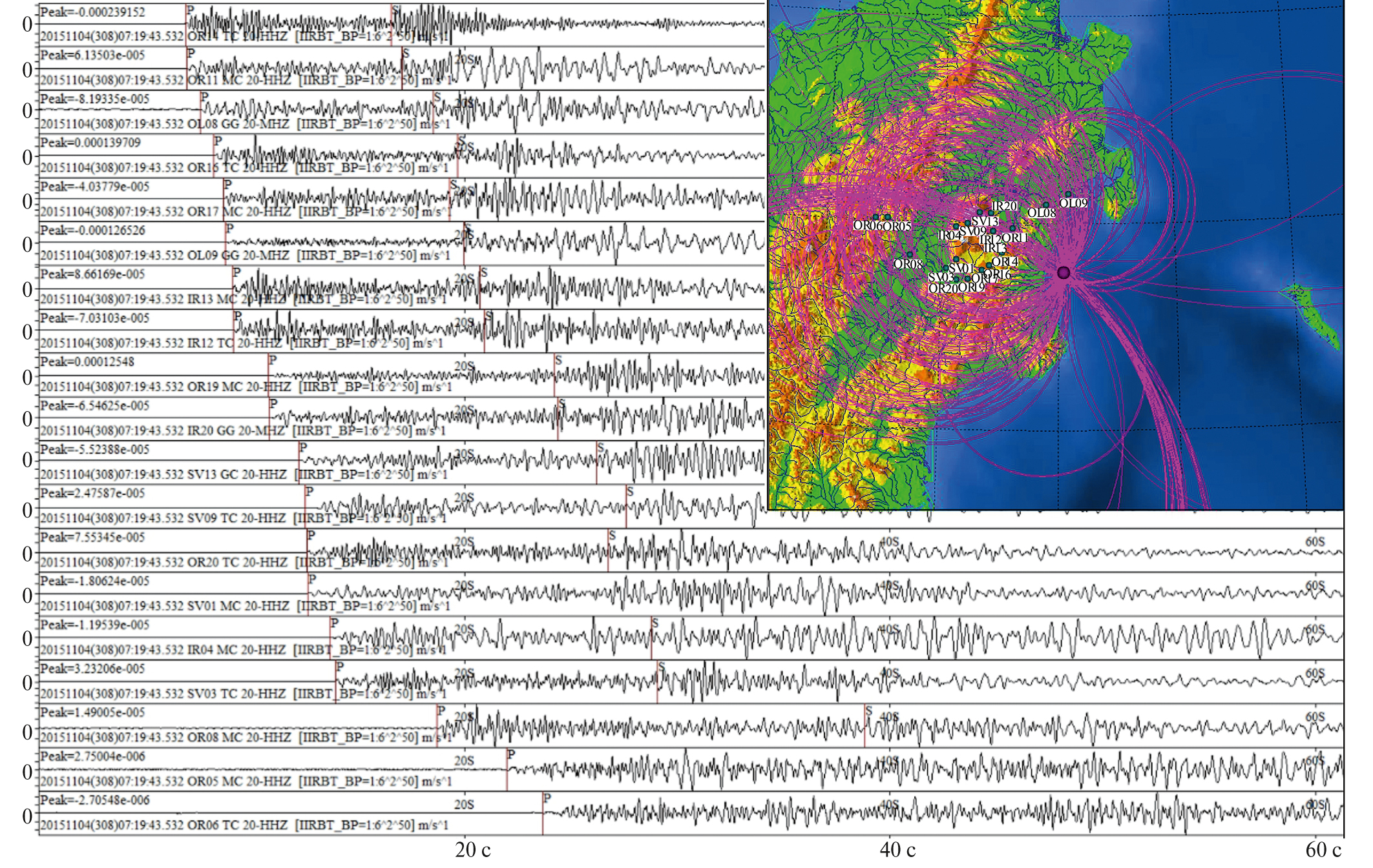 Рис. 2. Пример записи тектонического землетрясения 04.11.2015 г. в 07h 19m в Камчатском заливе на глубине ∼40 км на нескольких станциях KISS (вертикальные компоненты). На записях отмечены вступления P- и S-волн в процессе обработки в программе DIMAS. Надо отметить, что вступления S-волн отмечаются на горизонтальных каналах, которые здесь не представлены. На врезке показана карта с эпицентром и станциями, записи которых представлены на этом рисунке.
