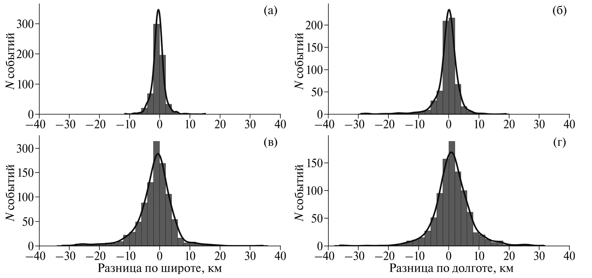 Рис. 8. Гистограммы распределения разности параметров землетрясений, определенных по станциям сети KAGSR и станциям KAGSR+KISS. Разница значений по широте: (а) – для вулканических землетрясений; (в) – для региональных землетрясений. Разница значений по долготе: (б) – для вулканических землетрясений; (г) – для региональных землетрясений. Черная линия – результат аппроксимации методом оценки формы распределения с помощью ядра Гаусса.
