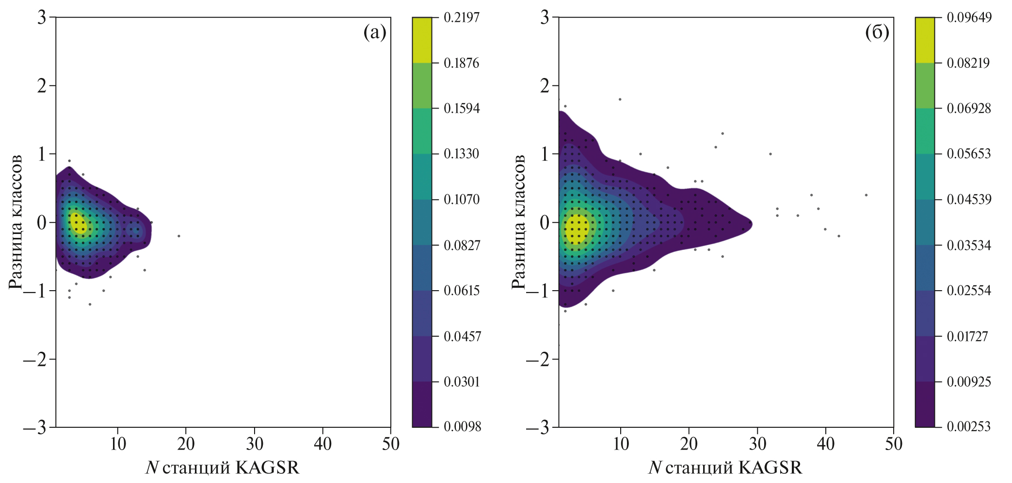 Рис. 13. Совместная плотность распределения по разнице энергетических классов и количества станций сети KAGSR, участвующих в обработке землетрясений: (а) – для вулканических землетрясений; (б) – для региональных землетрясений.