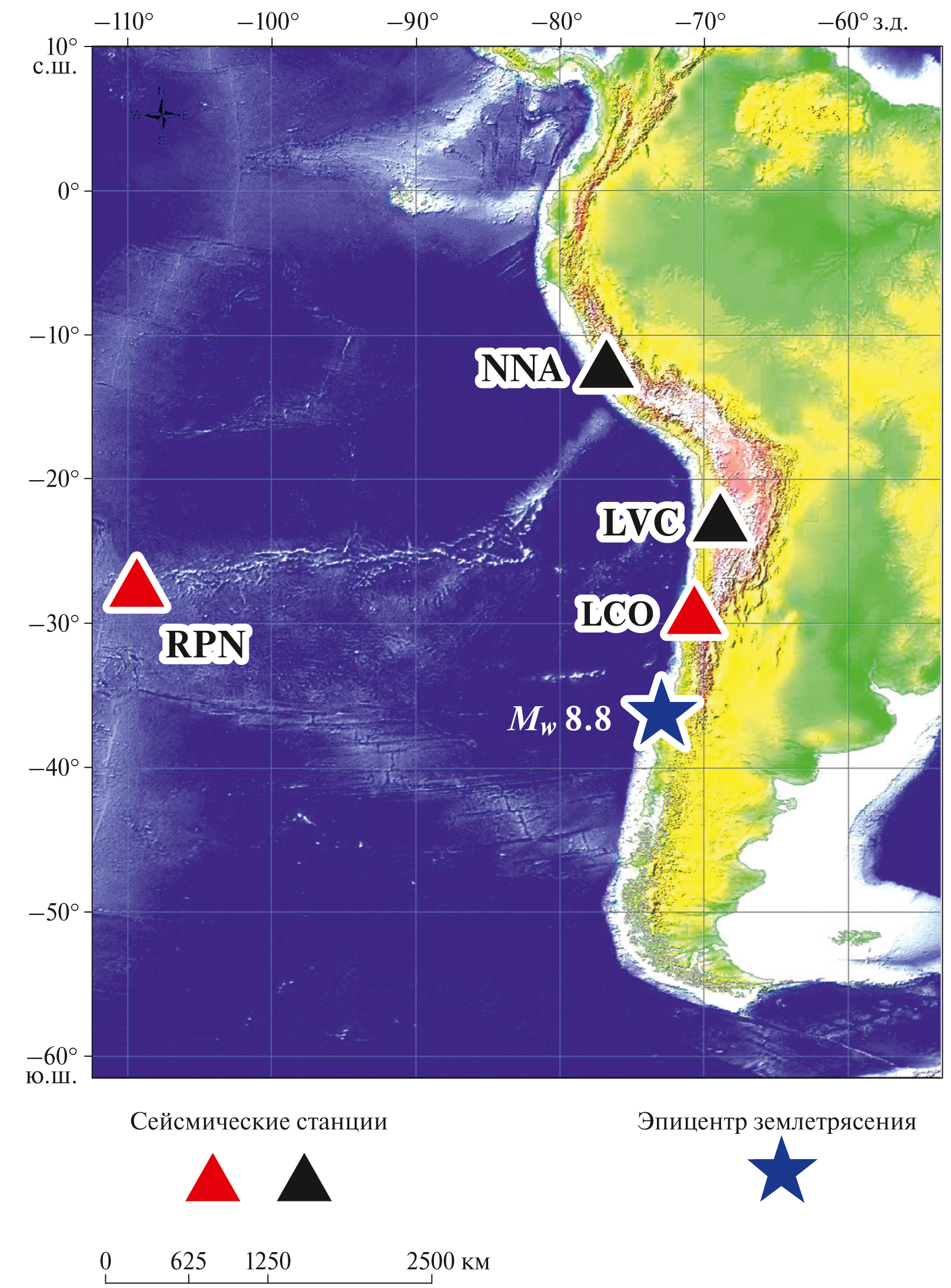 Это землетрясение не имело столь катастрофических социальных последствий, как события возле Суматры и Японии, в связи с чем, по-видимому, его описанию не уделялось большого внимания в научной литературе. У нас была возможность изучить сейсмические записи нескольких широкополосных станций системы IRIS, расположенных на континенте Южной Америки и в прибрежной области Тихого океана. Эти станции, а также эпицентр землетрясения в Чили показаны на рис. 1. Станция LCO [29.01° ю.ш.–70.70° з.д.] расположена в горной системе Анд на высоте H = 2299 м, на расстоянии R = 800 км от эпицентра Чилийского землетрясения; станция LVC [22.61° ю.ш.–68.91° з.д.] – в той же горной системе R = 1700 км и H = 2930 м; станция NNA – [11.99° ю.ш.–76.84° з.д.] на побережье Тихого океана, R = 2900 км, H = 575 м; станция RPN [27.13° ю.ш.–109.33° з.д.] – на острове Rapanui, Easter, R = 3700 км, H = 9 м. Все эти станции оборудованы сейсмометрами STS-1, позволяющими исследовать при одной и той же чувствительности колебания в диапазоне 0.2–360 с [Wieland, Streckeisen, 1982]. Канал LHZ каждой станции регистрирует вертикальную скорость смещения грунта.