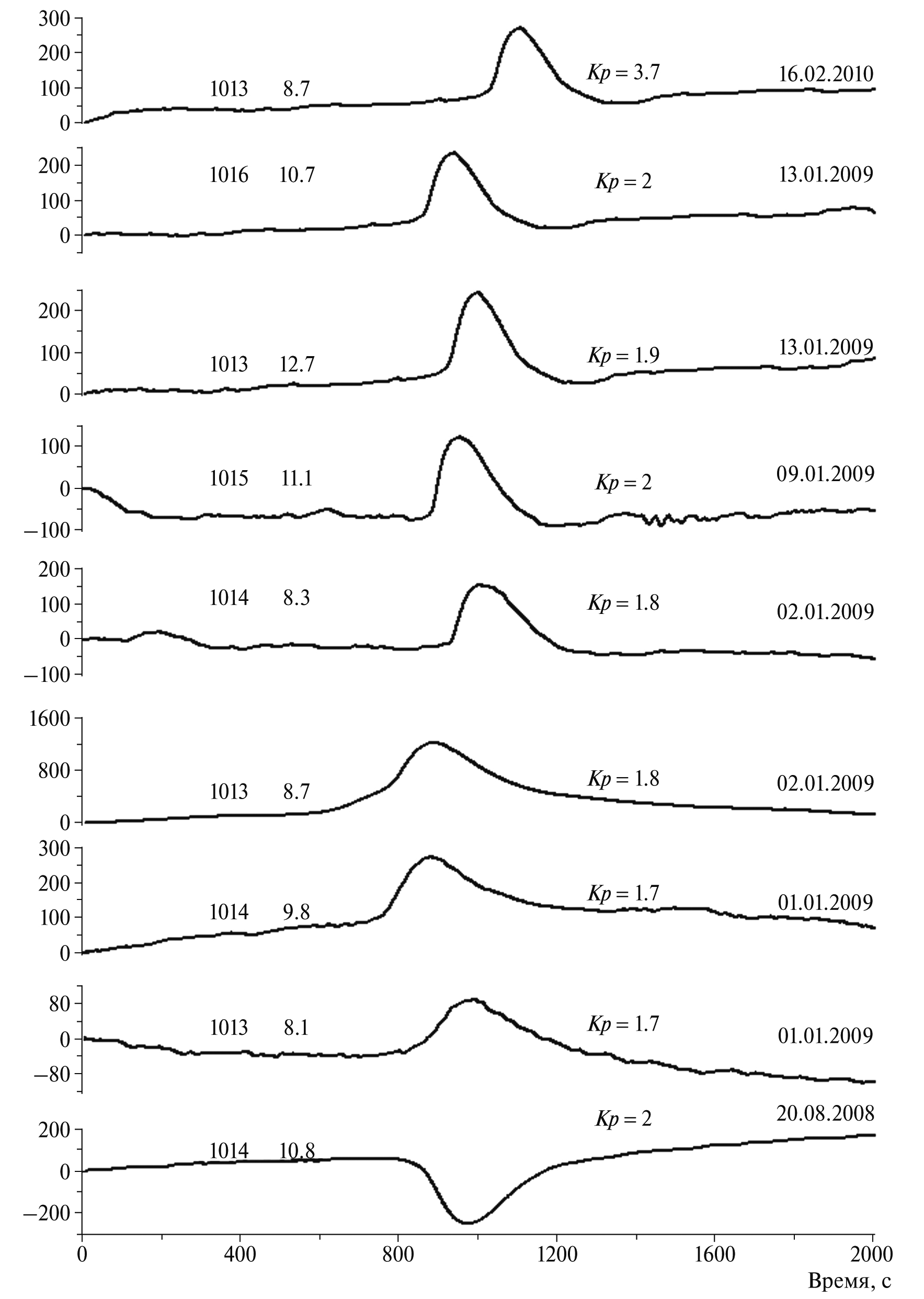 На ближайшей к эпицентру станции LCO один импульс появился в 2008 г., а в 2009 г. их было много. Примеры импульсов, не искаженных землетрясениями или помехами неизвестного происхождения, приведены на рис. 3. Слева от импульсов указаны величины атмосферного давления и скорости ветра в день возникновения соответствующего импульса. Для этого использованы данные метеообсерватории La Seren, расположенной в 50 км от сейсмостанции LCO. Данные о приведенных на рисунке индексах геомагнитной активности получены из архива http//www.spaceweatherlive.com. В таблицах архива указаны величины планетарных Kp-индексов – отклонений магнитного поля Земли от нормы в течение трехчасовых интервалов соответствующих суток (GFZ Potsdam official Kp-index). Значения Kp-индексов при самых сильных бурях достигают величины 9.