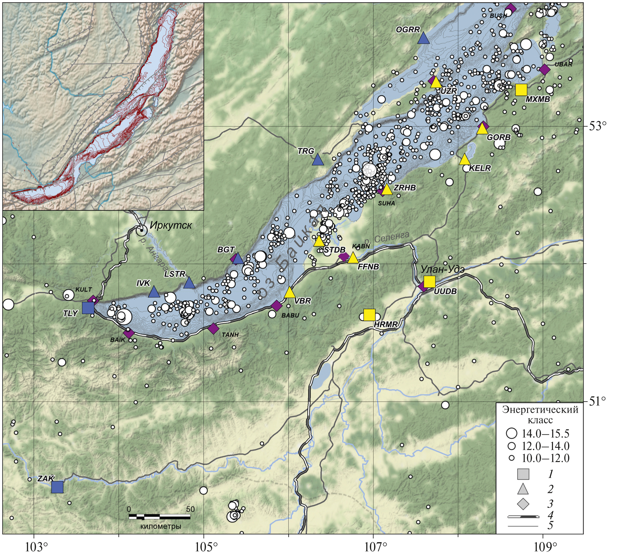 В Байкальской рифтовой зоне ежегодно происходит несколько тысяч землетрясений, при этом на долю относительно сильных и умеренных событий (энергетический класс Kр ≥ 10) приходится всего несколько процентов [Radziminovich et al., 2013; Тубанов и др., 2021]. В центральной части рифта, в основном, эпицентральные области этих землетрясений расположены непосредственно в Южнобайкальской впадине (рис. 1).