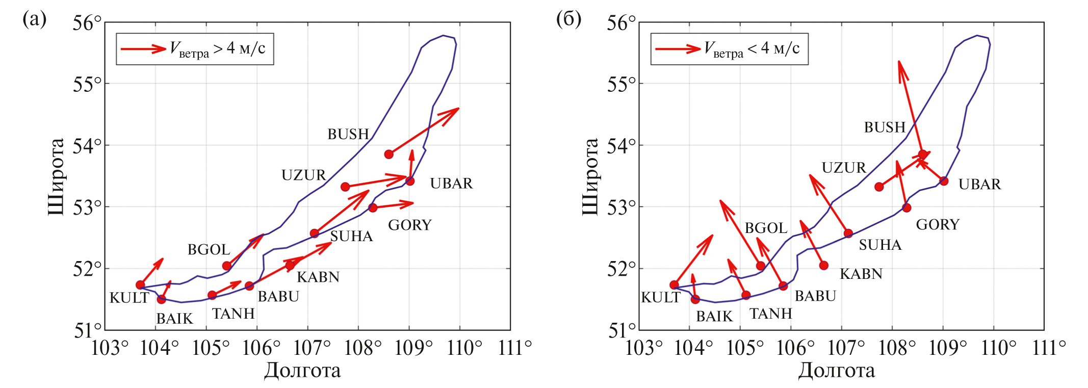Большинство исследователей [Xu et al., 2017; Smalls et al., 2019; Carchedi et al., 2022] полагают, что существенный вклад в генерацию озерных микросейсм оказывает ветровая нагрузка. В пределах котловины озера среднемесячные и годовая скорости ветра выше в Центральном и Южном Байкале и ниже на Северном Байкале. Это связано с преобладанием выхода циклонов и тыловых вторжений на южную и среднюю части озера и с большей орографической защищенностью северной котловины. В холодное время года на побережье оз. Байкал доминируют ветры с суши на озеро, в теплое – с озера на сушу [Атлас…, 1977]. Сезонность регистрации озерных микросейсм на оз. Байкал, вероятно, определяется ледовым режимом. Озеро ежегодно полностью замерзает (средняя толщина льда зимой – 1 м), покрываясь льдом постепенно с севера на юг, покрыто льдом почти 5 месяцев в году. В конце октября замерзают мелководные заливы, в середине зимы (1–14 января) – наиболее глубоководные районы. Сроки ледостава значительно меняются по годам – колебания достигают 40 дней. Взлом льда начинается 25–30 апреля.