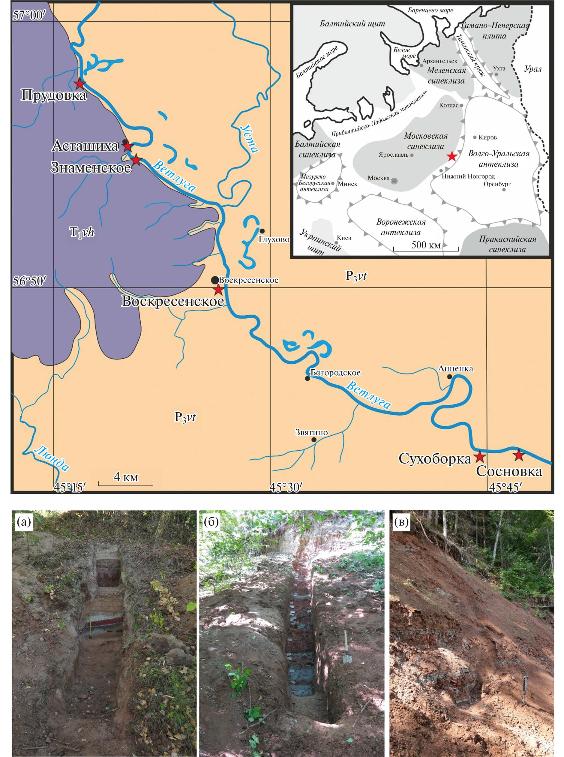 Рис. 1. Расположение изученных разрезов на геологической карте района нижнего течения р. Ветлуга (cверху) и фотографии некоторых из изученных разрезов (cнизу): (а) – Сухоборка, обн. 1827A; (б) – Асташиха, обн. 1918; (в) – Прудовка, обн. 1631B. Условные обозначения: P3vt – быковский, нефёдовский и жуковский горизонты, T1vh – вохминский горизонт. Врезка сверху справа: положение изученных разрезов (красная звезда) на схеме тектонического районирования Восточно-Европейской платформы.