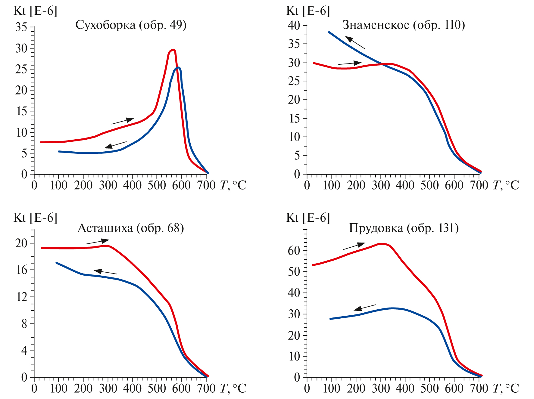 Рис. 3. Температурная зависимость магнитной восприимчивости наиболее типичных образцов горных пород некоторых из изученных разрезов. Нагрев – красная кривая, охлаждение – синяя кривая.