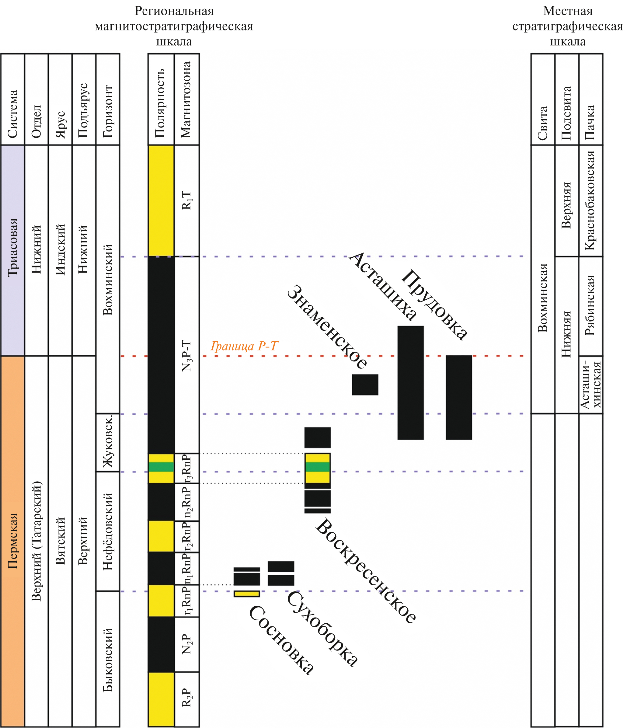 Разрез Воскресенское имеет более сложное магнитостратиграфическое строение (рис. 8, рис. 12). Большая часть разреза соотносится с ортозоной RnP. Нижняя часть (слои 1–5) образовалась в эпоху прямой полярности n2RnP, слои 6–17 – в эпоху обратной полярности r3RnP. Ранее эта зона обратной полярности интерпретировалась как r2R3P [Граница…, 1998] или как r1N1T [Балабанов, Муравьев, 2010]. В середине магнитозоны r3RnP есть интервал с аномальными значениями широты ВГП, не характерными для границы перми и триаса. Такой же интервал аномальных палеомагнитных направлений внутри субзоны r3RnP выявлен ранее в трех разрезах бассейна р. Оки [Фетисова и др., 2022; 2023] и выделяется как a1r3RnP: здесь он располагается в основании жуковского горизонта. Его обнаружение в разрезе Воскресенское позволяет распознать нижнюю границу жуковского горизонта в бассейне нижнего течения р. Ветлуга. Верхняя часть разреза (слои 18–19) соответствует зоне прямой полярности N3P–T.