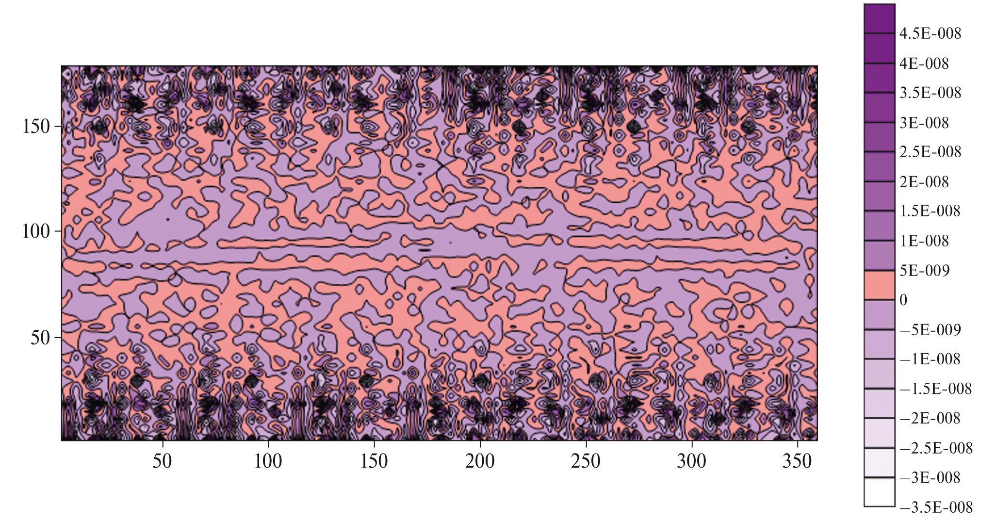 Далее, в точках той же самой сети наблюдений, для которой были вычислены значения радиальной компоненты магнитного поля по известной формуле для разложения гравитационного потенциала в ряд по полностью нормированным присоединенным функциям Лежандра [Gudkova et al., 2020], нами были выполнены расчеты радиальной компоненты гравитационного поля Меркурия.