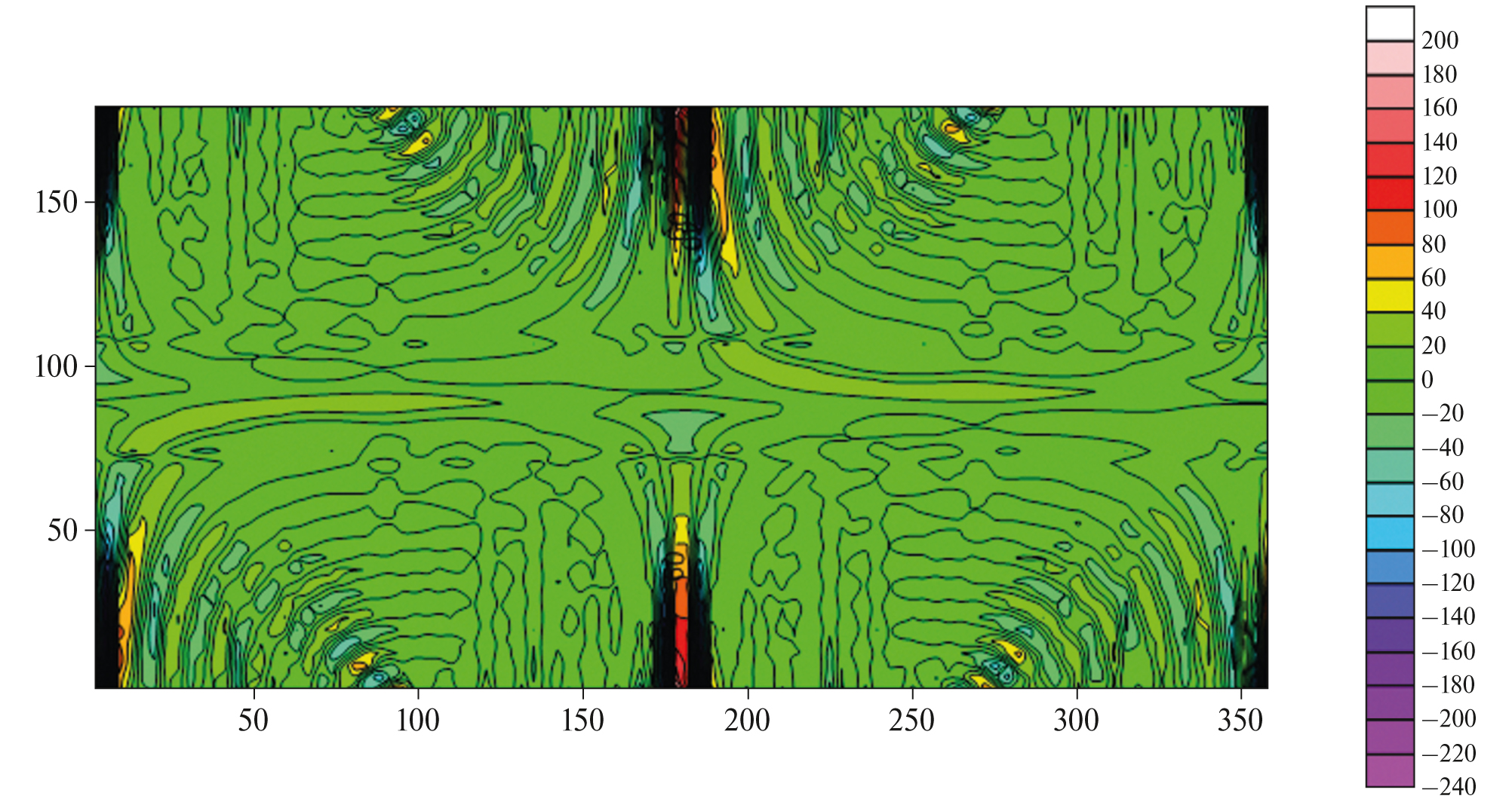 На рис. 3 и рис. 4 изображены распределения эквивалентных магнитных масс, восстановленных по синтезированному магнитному полю на расстоянии 50 и 100 км от поверхности планеты. Синтез радиальной компоненты магнитного поля осуществлялся по полученным решениям обратной задачи для “сырых” данных, измеренных на эллиптической орбите. Мы рассчитали модельное гравитационное поле по формулам (49), (50), значения радиальной компоненты гравитационного поля Меркурия приведены на рис. 5. На рис. 6 показано распределение гравитационных масс, определенных по синтезированному гравитационному полю (см. формулы (49)–(51)) на сферической поверхности, отстоящей от поверхности Меркурия на 50 км соответственно. Из рис. 3, рис. 4 видно, что характер распределения эквивалентных носителей практически не меняется в зависимости от сферы, на которой вычислялось синтезированное поле. Характеристика “точности” эквивалентного решения (см. (51)) практически не менялась при расчетах на сферах, удаленных от поверхности планеты на расстояние не более 100 км. Для гравитационного поля она составила 1–5%, для магнитного – 3–7%.