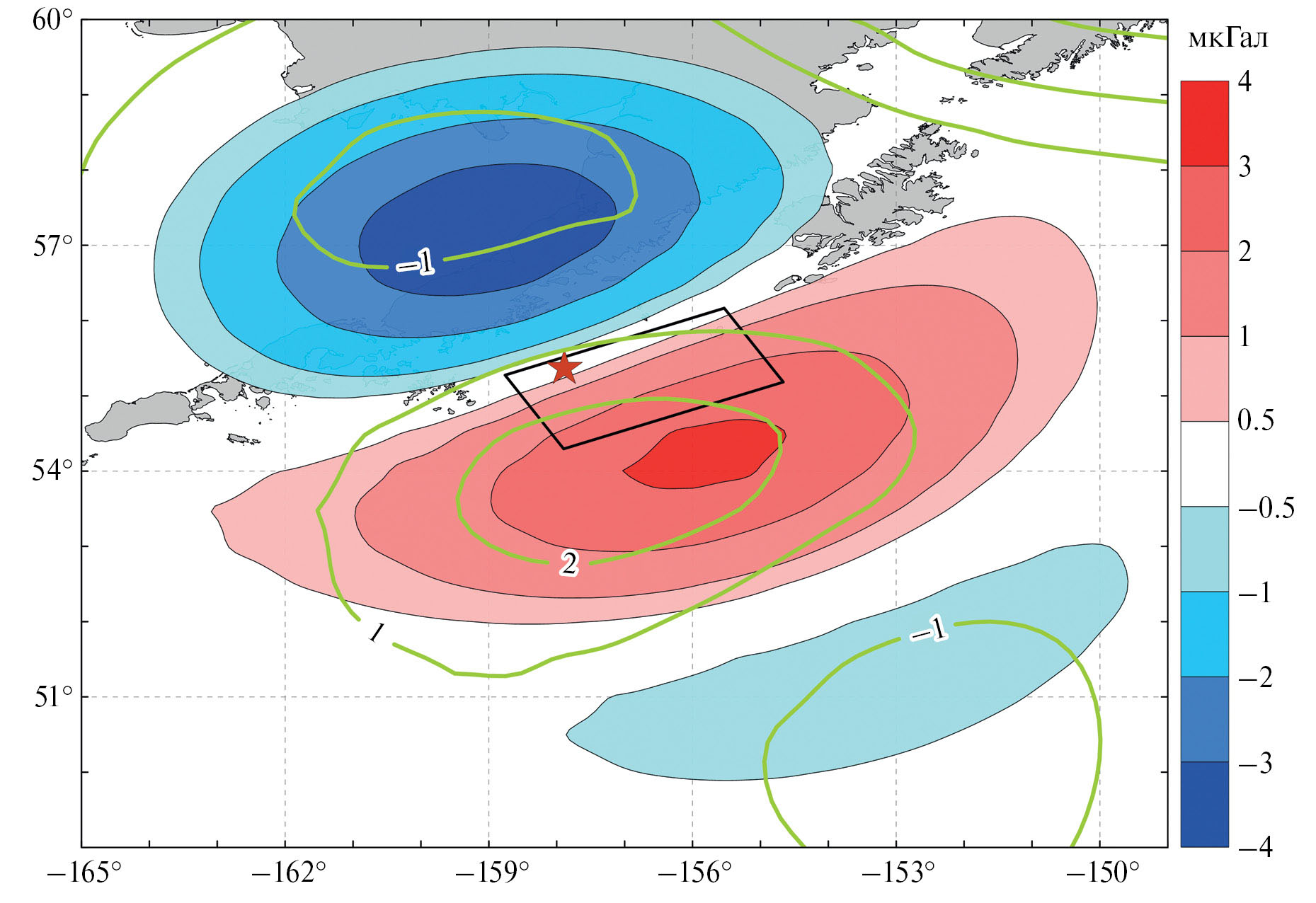 Рис. 4. Косейсмическая гравитационная аномалия. Цветом показана теоретическая аномалия, рассчитанная по модели поверхности разрыва. Изолинии – аномалия в очаговой области, полученная по разности линейных трендов до и после землетрясения.