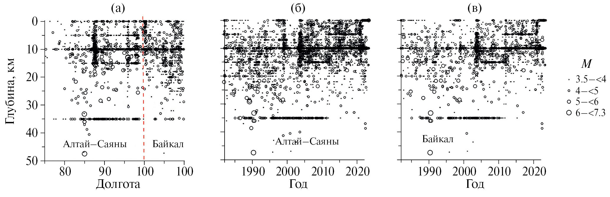 Отметим, что основные каталоги (“Землетрясения Северной Евразии”), имеющиеся для данной территории, получены разными филиалами Единой Геофизической службы РАН (ФИЦ ЕГС РАН), а именно Алтае-Саянским (53 станции) и Байкальским (21 станция) филиалами [Виноградов, 2023]. В Алтае-Саянском филиале обработка осуществляется в программе SeisComp [Weber et al., 2007] (гипоцентральные решения рассчитываются в рамках двухслойной региональной модели с заданной средней глубиной очагов в 15 км). В Байкальском филиале локализация гипоцентров проводится по программе “Регион”, основанной на работах С.И. Голенецкого [Голенецкий, 1990]. В расчетах используются следующие параметры: мощность земной коры 40 км, начальная глубина гипоцентров 10 км, скорости прямых продольных и поперечных волн 6.15 и 3.58 км/с соответственно [Radziminovich, 2022]. Кроме этого, в Байкальском филиале для релокации гипоцентров для некоторых землетрясений привлекаются дополнительные программы – HYPOINVERSE [Klein, 2002], HYPOELLIPSE [Lahr, 1999], HYPOCENTER [Lienert, 1994].
