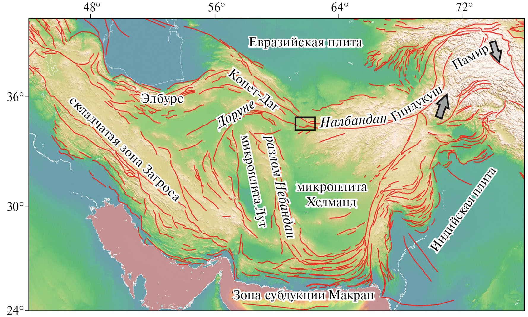 Разлом Налбандан, с подвижкой по которому связан очаг землетрясения, принадлежит горной системе Гиндукуш. Важнейшими тектоническими элементами глобального плана является зона субдукции Макран, по которой Аравийская плита погружается под Евразийскую. Граница между плитами здесь занимает обширный участок около 1000 км, на котором располагаются две крупные микроплиты: Лут и Хелманд. В регионе присутствуют реликтовые зоны субдукции, которые проявляются в активной глубокофокусной сейсмичности на Памире и Гиндукуше. Микроплиты Лут и Хелманд разделены сдвиговой разломной зоной Небандан. С севера блок Лут ограничен разломом Доруне. Заметим, что опубликовано много различных сейсмотектонических моделей региона с существенно отличающейся картиной в деталях, но в целом значительных противоречий между ними нет. Представленная схема построена нами на основании цифрового рельефа, карты активных разломов и других источников – все в свободном доступе в интернете [Stocklin, Nabavi 1973; Berberian, King 1981; Siehl, 2015; Styron, Pagani, 2020].
