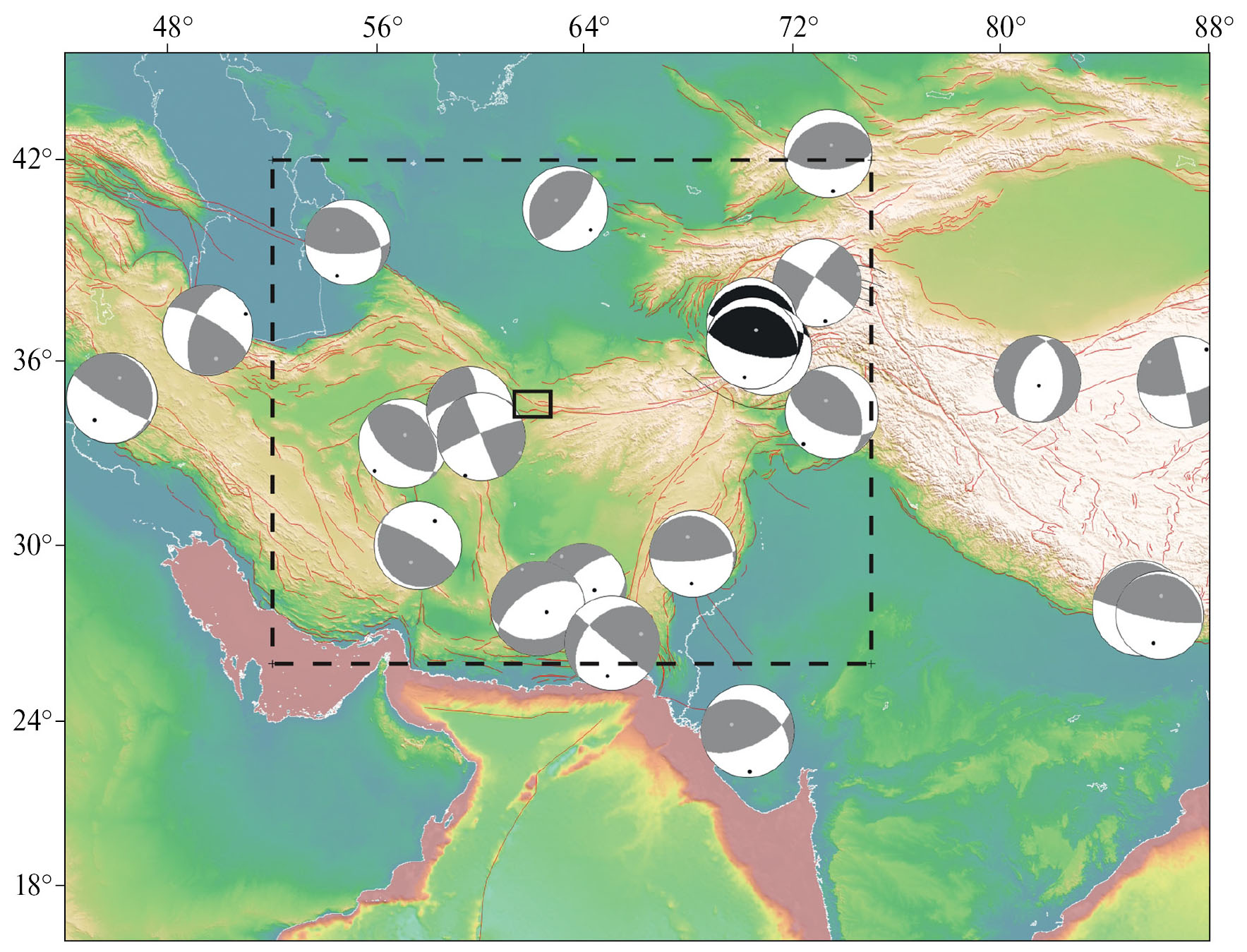 Рис. 4. Механизмы очагов сильных землетрясений (Mw ≥ 7.0) согласно источнику Global CMT (1976–2023 гг.) (Global CMT catalog. URL: http://www.globalcmt.org. Последнее скачивание в 2023 г.). Черным закрашены механизмы землетрясений Памиро – Гиндукушской зоны с глубиной гипоцентра 70 км и более. Пунктиром показана область, представленная детально на рис. 5. Активные разломы по работе [Бачманов и др., 2017] показаны красными линиями.