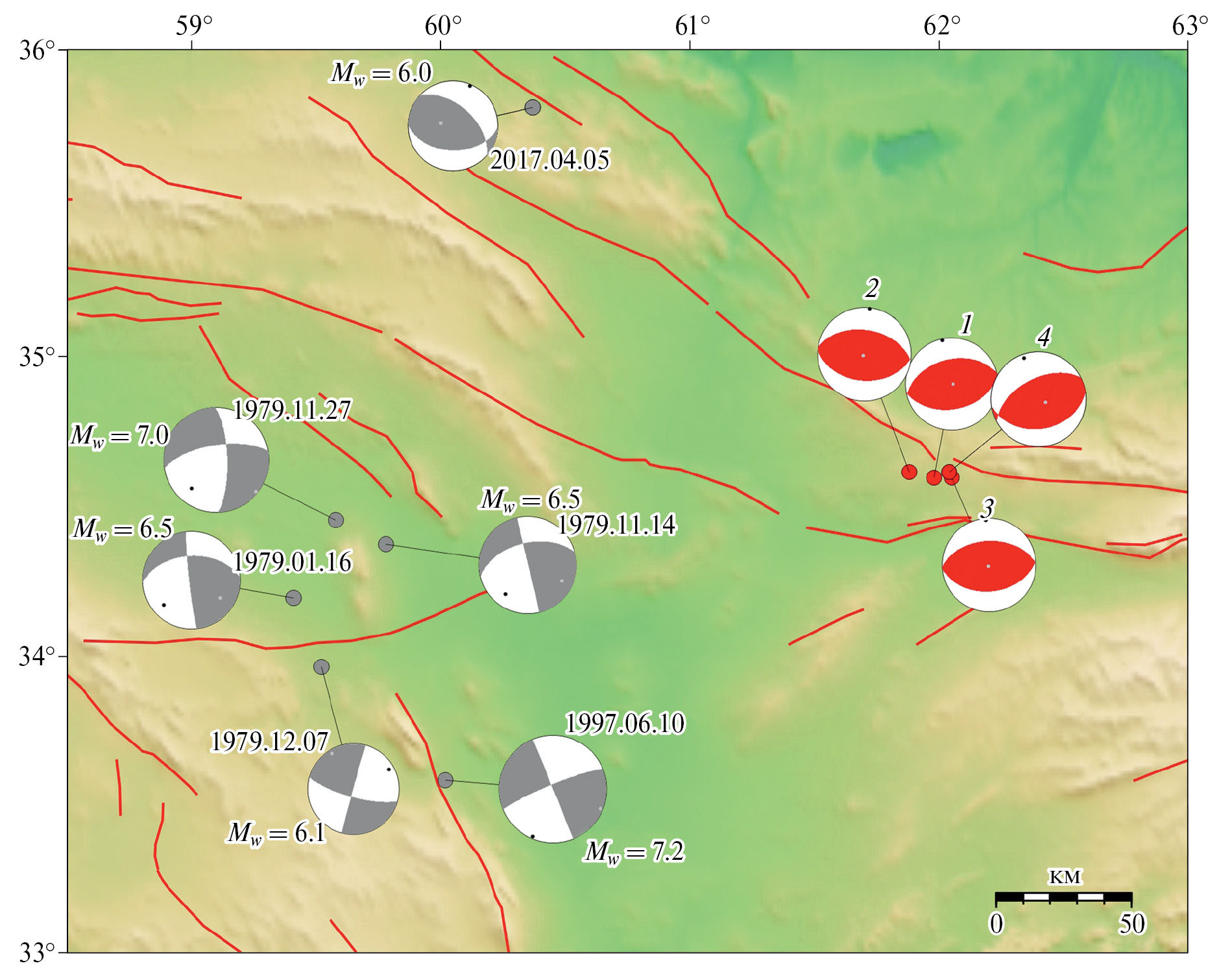 Рис. 6. Механизмы очагов землетрясений (Mw ≥ 6.0) согласно источнику Global CMT (Global CMT catalog. URL: http://www.globalcmt.org. Последнее скачивание в 2023 г.) в окрестностях Гератских землетрясений. Красным цветом выделены механизмы Гератских землетрясений. Номера землетрясений соответствуют таблице. Активные разломы по работе [Бачманов и др., 2017] показаны красными линиями.