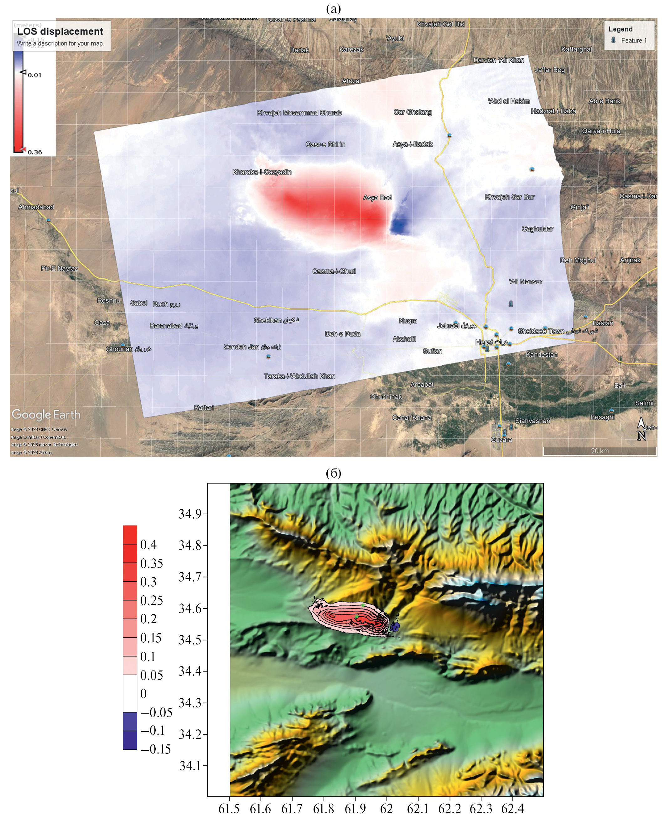Рис. 8. (а) – Поле смещений земной поверхности в направлении на спутник в метрах на карте Google Earth Pro. Красный цвет – смещения в сторону спутника (“поднятия”), синий – “опускания”; (б) – та же карта смещений (начиная с 50 мм) на цифровой модели рельефа ETOPO1.