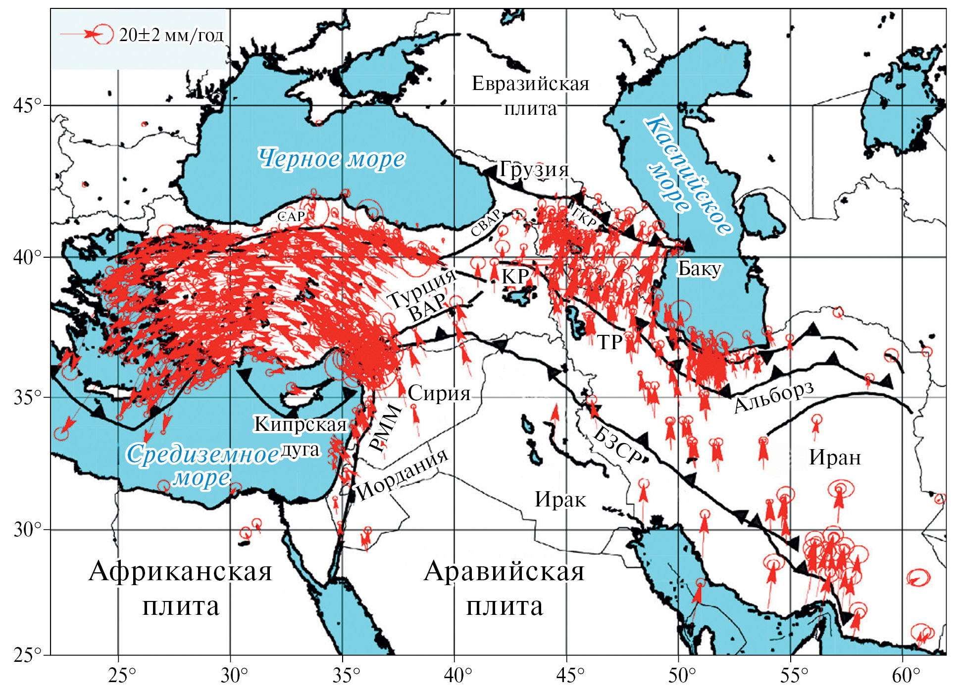 Рис. 8. Векторы горизонтальных движений в регионе, построенные по результатам ГНСС-наблюдений относительно закрепленной Евразийской плиты по работе [Ahadov, Jin, 2017]: САР – северо-Анатолийский разлом; ВАР – восточно-Анатолийский разлом; СВАР – северо-восточный Анатолийский разлом; ГКР – главный Кавказский разлом; КР – Кавказский разлом; ТР – Табризский разлом; РММ – разломов Мертвого моря; БЗСР – Битлис-Загрос система разломов.