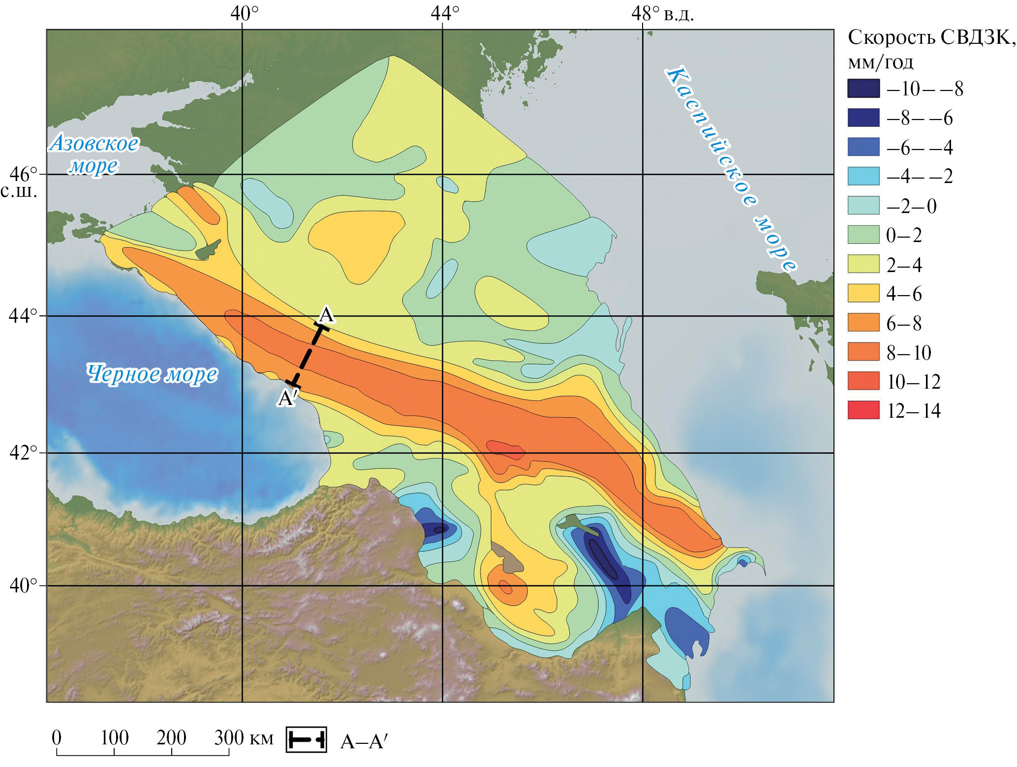 Рис. 11. Второй подъем Большого Кавказа (1970/75–1985/92 гг.) [Кафтан и др., 1995]. А–А′ – профиль геометрического нивелирования Зеленчук–Сухуми.
