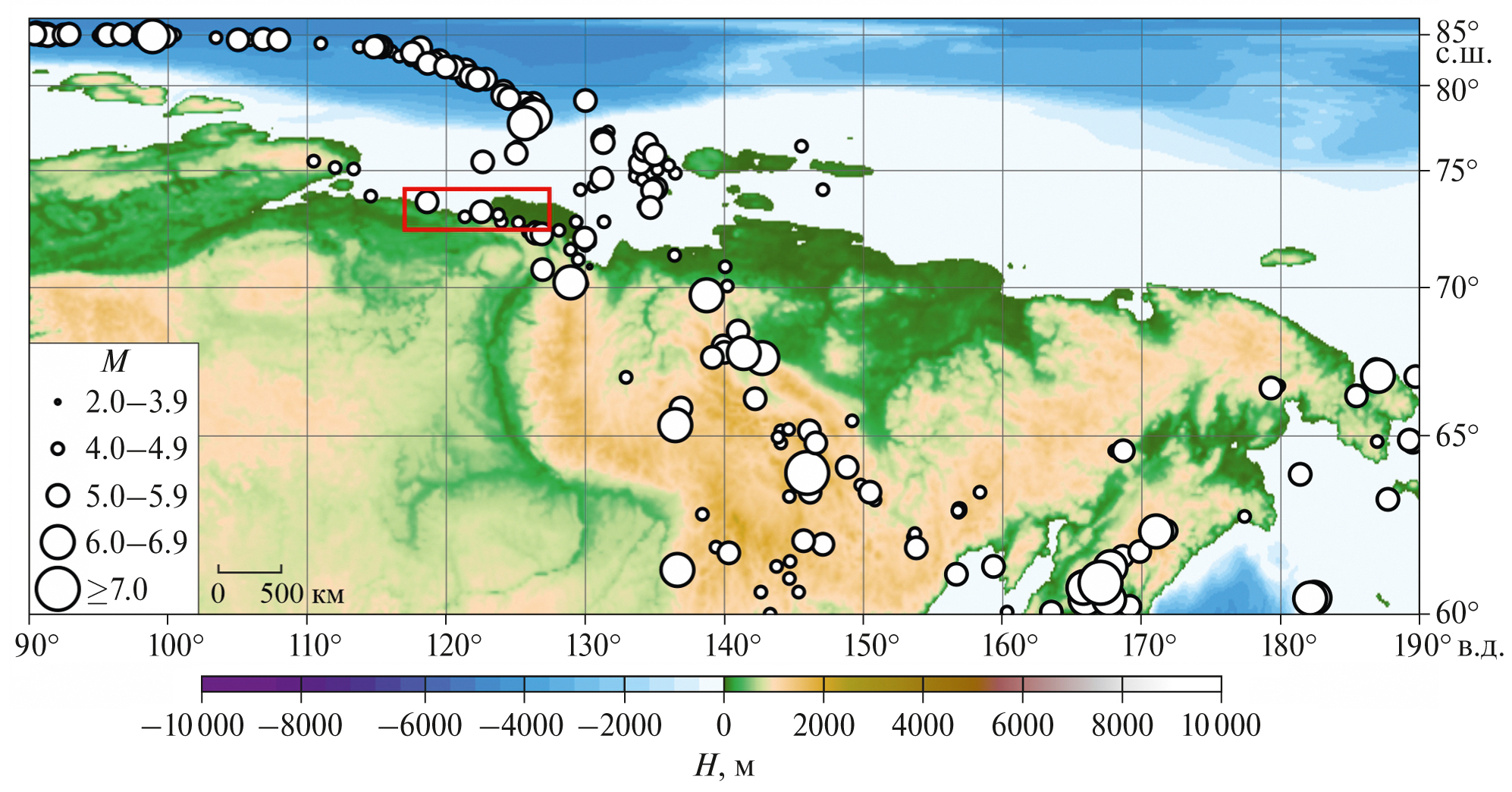 Континентальная часть исследуемой области представлена c запада на восток Таймырским складчатым поясом, занимающим полуостров Таймыр, докембрийской Сибирской платформой, мезозойским Верхояно-Колымским складчатым поясом, Охотско-Чукотским вулканогенным поясом и кайнозойским Корякско-Камчатским складчатым поясом (рис. 1а) [Зоненшайн и др., 1990a; 1990б]. На Таймырском полуострове эпицентры редких слабых землетрясений приурочены к его восточному побережью (рис. 1б) [Середкина, Козьмин, 2017; Morozov et al., 2021b]. Относительно высокий уровень сейсмической активности наблюдается на побережье Анабарского и Оленекского заливов моря Лаптевых, а также в дельте реки Лены. Здесь эпицентры большинства землетрясений тяготеют к крупным разрывным нарушениям субширотной ориентации, обрамляющим практически асейсмичную Сибирскую платформу [Имаева и др., 2017]. Наиболее сильные сейсмические события Верхоянского хребта сосредоточены в его северной части и представлены Булунскими землетрясениями 1927–1928 гг. (5 событий с M = 5.8–6.8), связанными с Хараулахтской системой разломов [Имаев и др., 1998; 2000; Fujita et al., 2009]. Согласно работе [Steblov et al., 2003] полюс вращения Евразийской и Северо-Американской литосферных плит расположен в непосредственной близости от эпицентров Булунских землетрясений (рис. 1). При этом в позднеинструментальный период наблюдений (с 1960 г.) во всем Верхоянском хребте регистрировались лишь относительно немногочисленные события с M < 5.0.