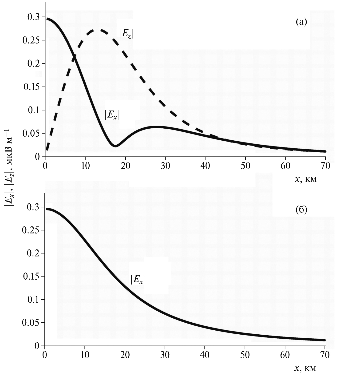 Как видно на рис. 3а, максимальная амплитуда вертикальной составляющей оказывается примерно равной амплитуде горизонтальной составляющей max Ez(x) ∼ max Ex(x) ∼ 0.3 мкВ/м. При этом подземный источник создает максимальное магнитное возмущение ∼ 2 пТл (рис. 2). Для ожидаемых сейсмо-магнитных возмущений c амплитудами ∼ 2 нТл, возмущение электрического поля должно быть Ez(x) ∼ Ex(x) ∼ 0.3 мВ/м. Горизонтальная компонента такого порядка величины может быть измерена на протяженной дипольной установке. Однако зарегистрировать вертикальное поле такой величины нереально, т.к. уровень шума при измерениях вертикального электрического поля имеет порядок нескольких В/м.