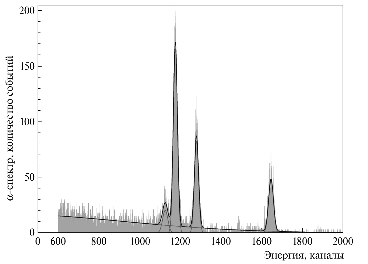 Рис. 2. Пример восстановленного амплитудного спектра импульсов, накопленного за 179 минут в измерениях содержания радона в воздухе наземного помещения.
